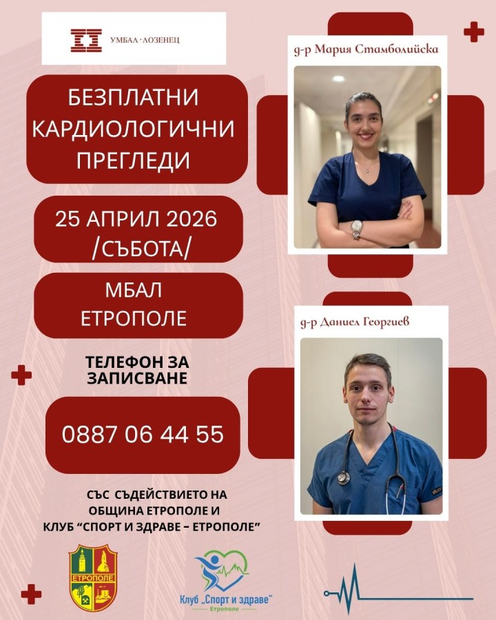 Община Етрополе, съвместно с клуб „Спорт и здраве – Етрополе“, организира кампания за безплатни кардиологични прегледи за жителите на общината....