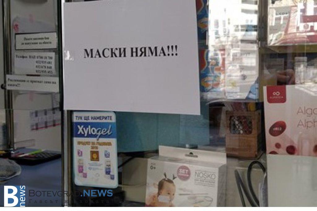 През последните дни в аптечната мрежа в Ботевград продължава да няма най-търсените консумативи срещу епидемията от коронавирус – маски и ръкавици. Нещо повече – поставен на вратата надпис, красноречиво говори за това. В търговската мрежа дефицит са вече и дезинфектантите – белина и спрей за почистване на алкохолна основа.
