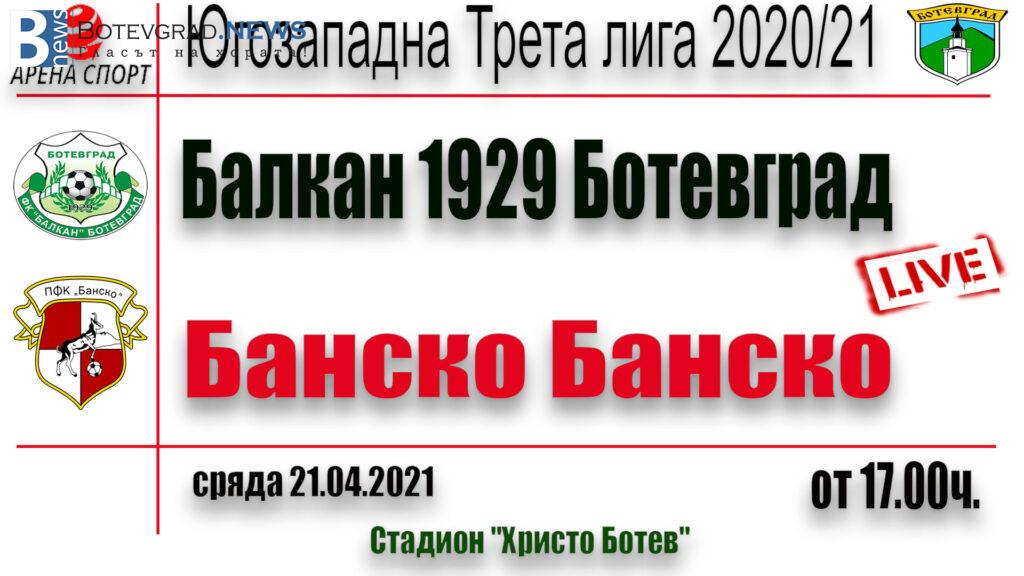 Мачът ще се играе на стадион „Христо Ботев“ от 17:00ч. Отборът на „Балкан 1929 „е в серия от девет мача без загуба, след възобновяване на първенството .Балкан записа 7 победи и 2 равенства, а съперникът му – ФК „Банско“ е на предпоследно място- 17-то, с 19 точки.