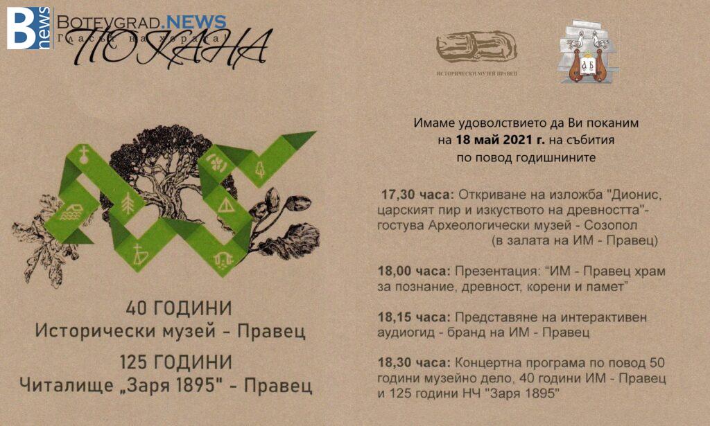 По повод 40 години от откриването на Исторически музей Правец и 125 години от създаването на читалище „Заря 1895“ – град Правец е организирана Празнична програма по случай годишнините. Тя съдържа следните мероприятия: