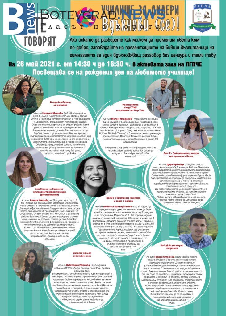 Он-лайн инициативата „Училище за лидери“ се състоя днес във формата на презентации на бивши възпитаници, сега студенти, на ПГПЧЕ“Алеко Константинов“ -Правец. В училищната проява се включиха: