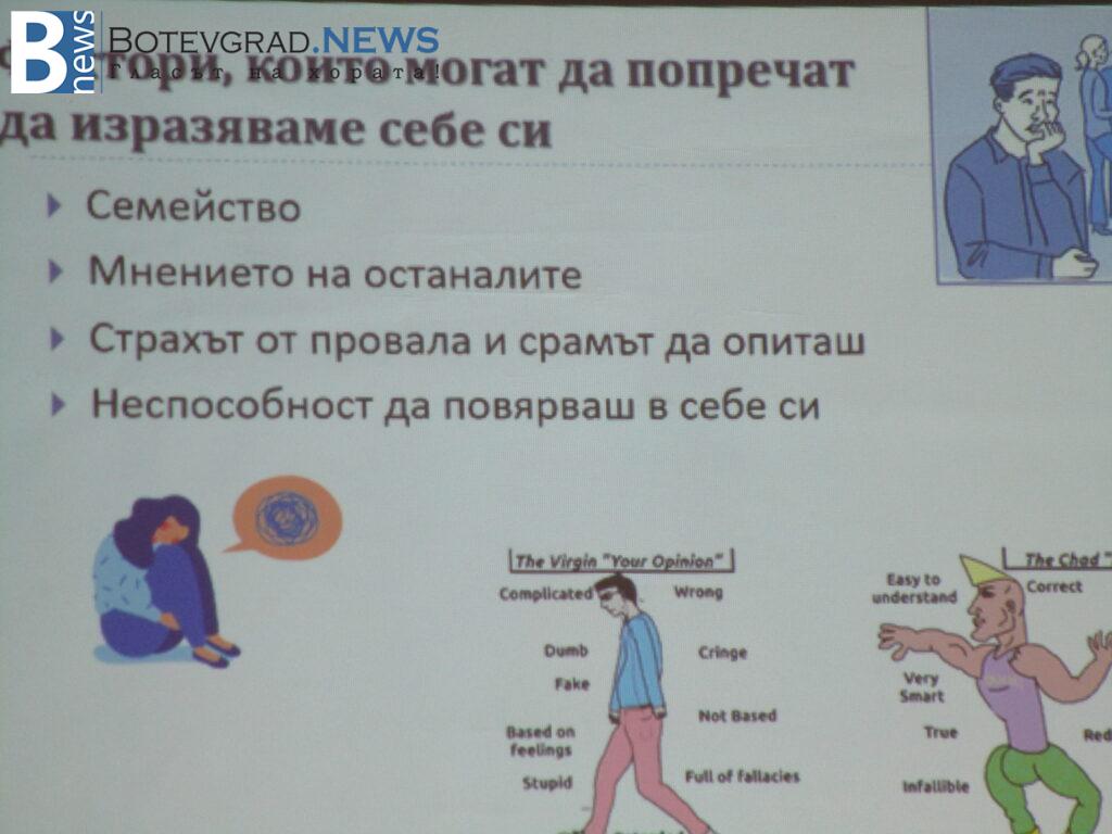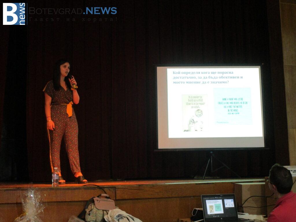 Темата „Силата на моя глас“ представи Виктория Иванова. „Случвало ли ви се е да чувате фразата – прекалено малък си, за да задаваш такива въпроси. А задавали ли сте си обратния въпрос – кой определя кога ще порасна достатъчно , за да бъда обективен и моето мнение да бъде значимо?“, започна Вики. Отговорът на този въпрос, според нея няма правилен отговор. „Ние сме тези, които определяме кога да изградим своето мнение, така че то да е от значение, защото възрастта е от значение, само когато вземем шофьорска книжка или отидем сами на дискотека“. Вики представите факторите, които пречат на младите хора да изразяват себе си – семейството, мнението на останалите, страхът от провала и срамът да опиташ, неспособност да повярваш в себе си. Вики посочи 5 стъпки, с които можем лесно да започнем да вярваме в себе си – разбери нещата, които те спират, научи се да се доверяваш на решенията си, по-често напускай зоната си на комфорт, оценявай всеки свой успех, поставяй си нови цели постоянно.