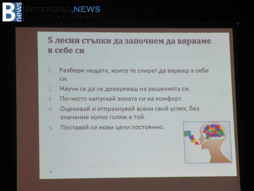Стела Китова презентира темата „Управление на времето“. То било могло да се организира добре, ако извършим следните дейности: правим списък с важните задачи за деня или седмицата, както и да се подредят по приоритети; поставяне на срокове; търсим и намираме мотивация – да се фокусираме върху крайния резултат и удовлетворение от постигната цел; концентрация – базирана на самодисциплината; комуникация – да потърсим помощ при реализирането на целите; почивка – да се заредим с енергия и готовност за още по-усилена работа; създаване на собствен режим – на работа, на сън, на храна; отлагане на задачите – чувстваме вина, паникьосваме се и губим енергия, несигурност и страх дали ще се справим със задачите, другите как щем ме оценят. В целия процес на управление на времето ключова роля има мотивиращата обстановка, а планът за работа да е разделен на отделни стъпки – това бяха съветите на Стела.