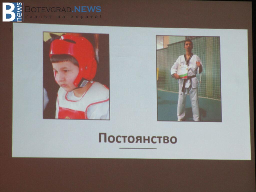 Темата “На какво ме научи спортът“ представи Георги Стоянов, който подчерта, че ако не е бил спортът не би имал настоящата визитка. Той сподели, че спортът е част от живота му 15 години и е бил начин на мотивация. Той изрази надежда, че ако учениците, участващи в Училище за лидери приложат поне едно от нещата, на които се учат от тях, биха се радвали. „Бъдете любопитни инати, докато не получите отговори на въпросите ви и не се страхувайте да правите грешки, докато не разберете, къде точно грешите“ ,посъветва Георги. Пет основни качества, според него са били важни при изграждането му като личност – постоянство , уважение, адаптивност, екипност, самосъзнание. Георги е бил от двете страни на монетата в спорта – бил е състезател – първи дан по таекуон-до и треньор. Работил е с различни характери и съответно е трябвало да проявява различен подход в общуването с противниците си на ринга, също така и с трениращите. Георги посъветва учениците да бъдат наясно със слабите си страни и грешките си и да не забравят да се обръщат назад и да се учат от грешките си.