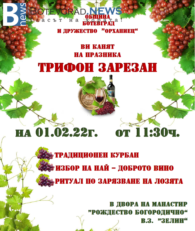 На 1-ви февруари Община Ботевград ще отбележи българския народен празник, посветен на свети Трифон – Трифон Зарезан.