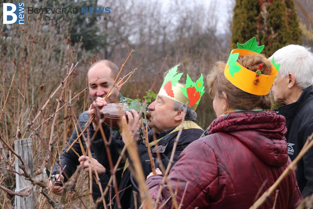 Кметът на селото, Царят на виното и Царицата на лозята заедно изпълниха ритуала по зарязване на лозите.