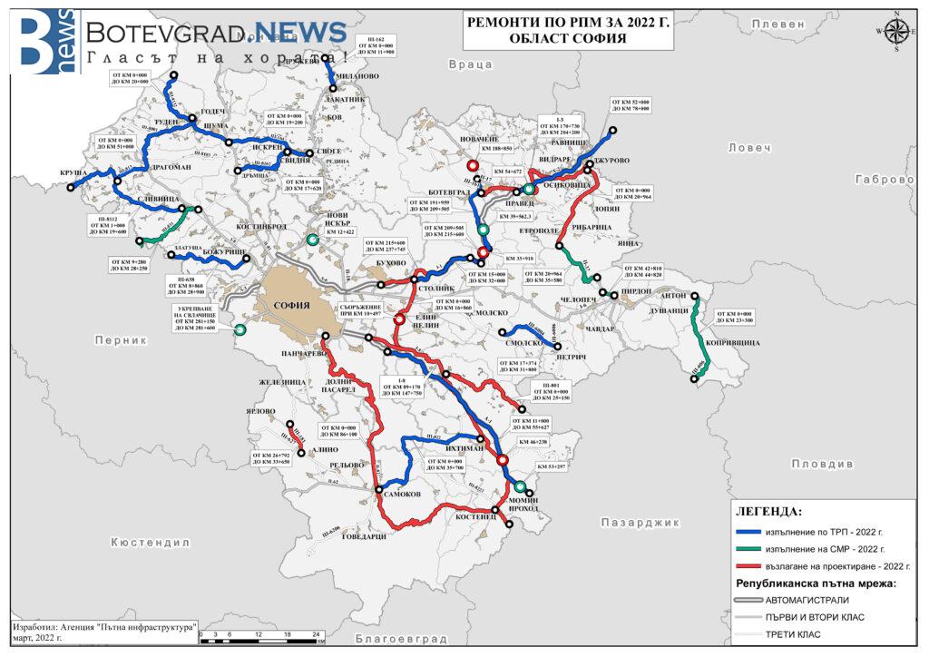 Ремонтът на около 3 000 км пътища предвижда одобрената инвестиционна програма на Агенция „Пътна инфраструктура“ за 2022 г. Картите с пътищата за ремонт по области са публикувани на интернет страницата на Агенция “Пътна инфраструктура”.