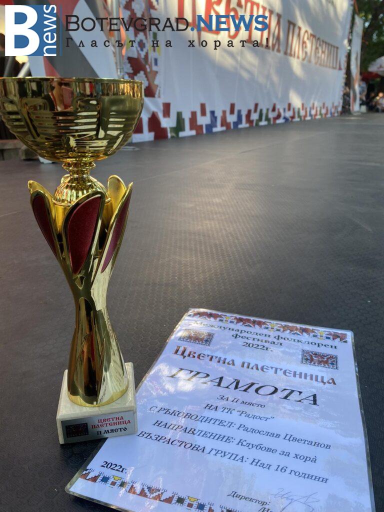Танцов клуб „Радост“, с ръководител Радослав Цветанов, спечели второ място на международния фестивал „Цветна плетеница“ в гр. Бухово, който се състоя днес, 5 юни. Клубът участва с два танца- Ботевградско хоро и хоро „Чичина“ и във възрастова група над 16години. За представянето си клубът бе удостоен с грамота и статуетка.