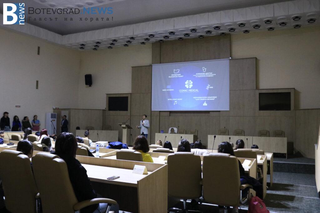 Врабевски разказа на присъстващите учители и ученици от X и XI клас за своята дейност като учредител и председател на Фондация „Българска памет“и като собственик на организацията „Comac Medical“, която е най-голямата научноизследователска организация в югоизточна Европа и има за цел да разработва, управлява и контролира проекти в областта на научноизследователската и развойната дейност в клиничната медицина. Проектите на организацията се разработват в 30 държави на територията на Европа, Азия и Америка.
