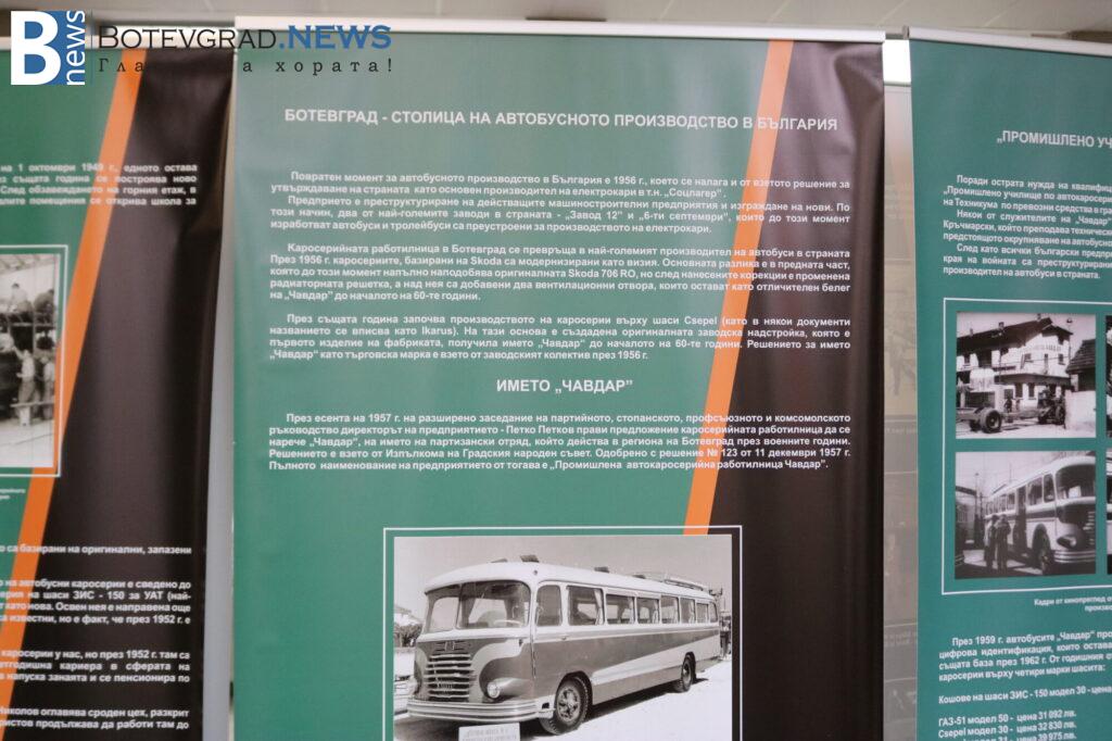 Създадена от екипа на Исторически музей – Ботевград, изложбата има мобилен характер и се състои от 25 ролбанера, съдържащи прецизно подбран и анализиран документален и снимков архив. Базирана на книгата на Иван Колев „Автобусите на Ботевград“ и възможна със съдействието на инж. Александър Гавалюгов – зам. директор по развитие и маркетинг в завод „Чавдар“ и на негови бивши колеги. Като комплимент към публиката, добавени са и пет макета на най-популярните модели автобуси, произвеждани в завода.