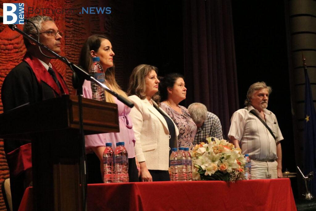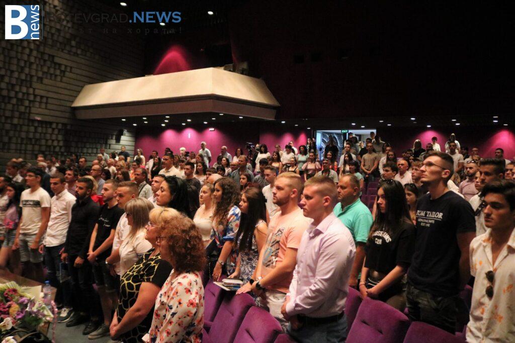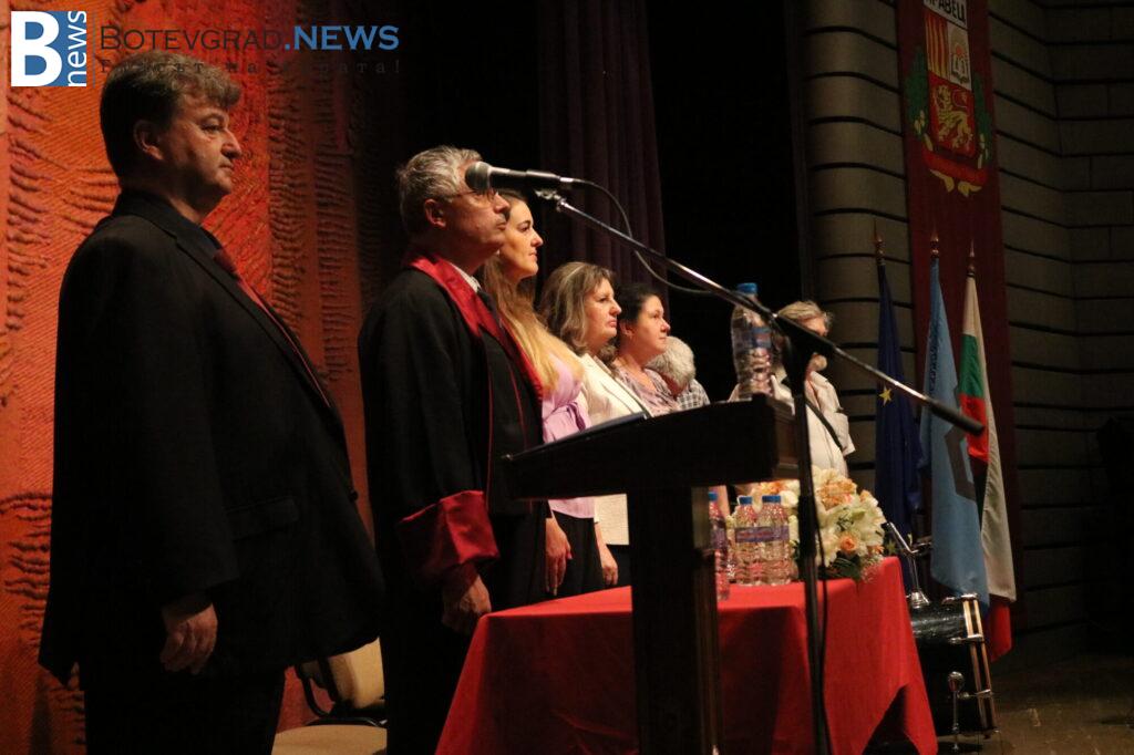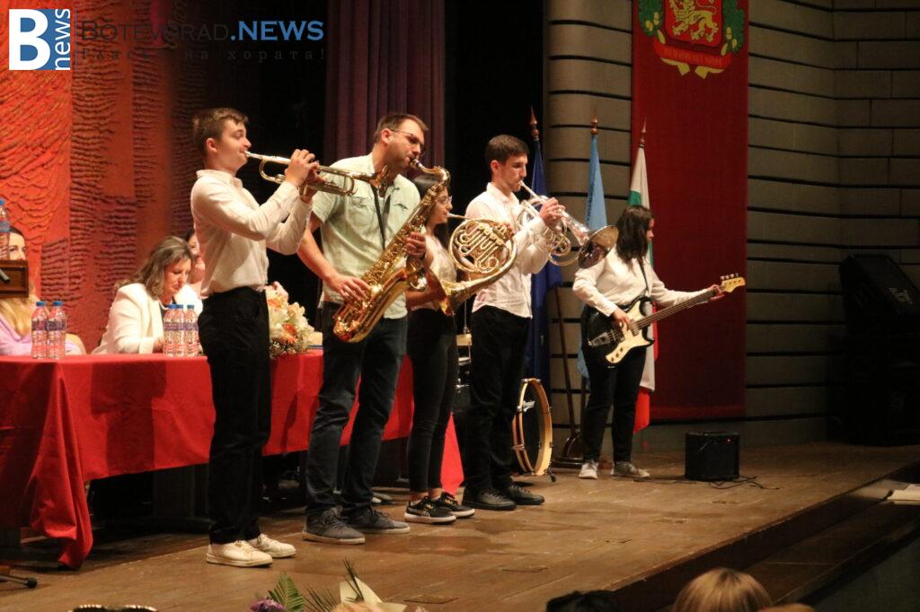 Церемонията бе открита със ставане на крака за химна на Република България и на Европейския съюз, слек което последва изпълнение на духовия оркестър на гимназията.