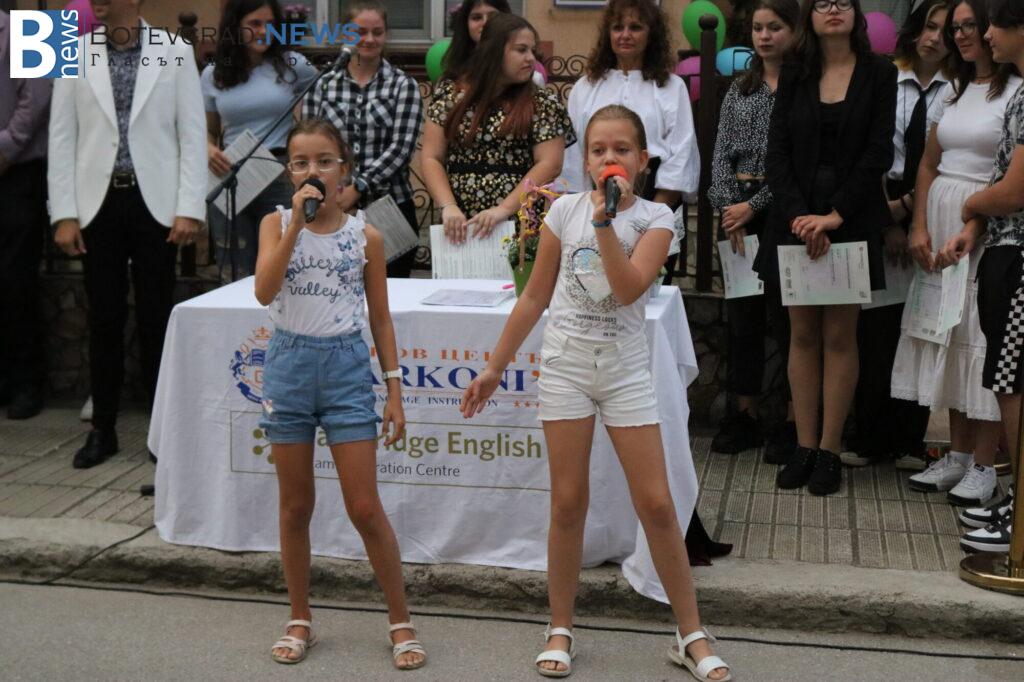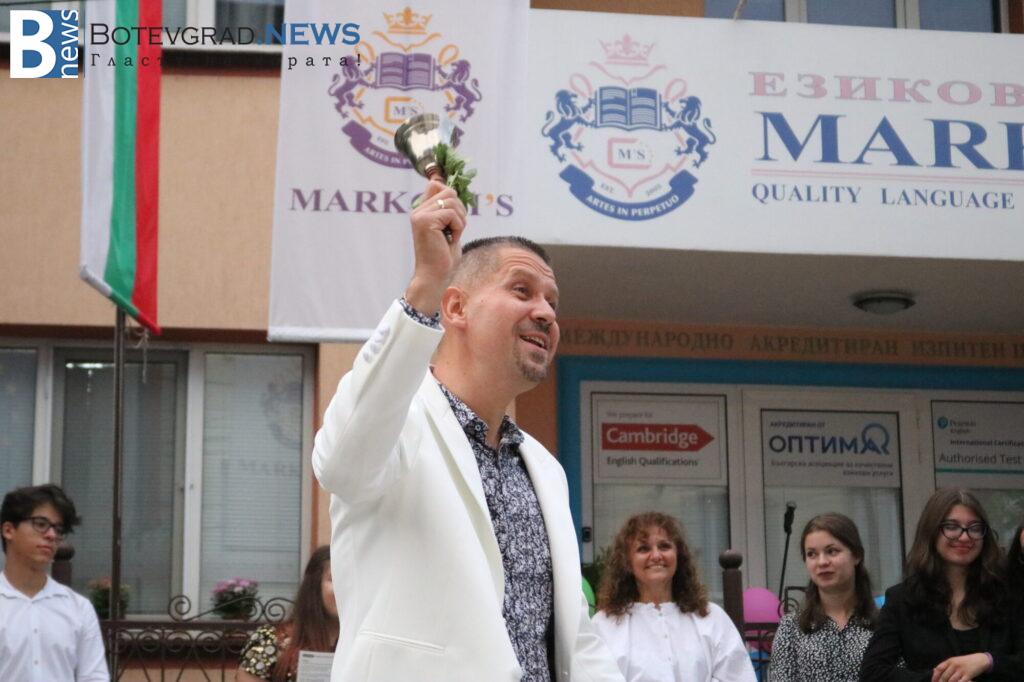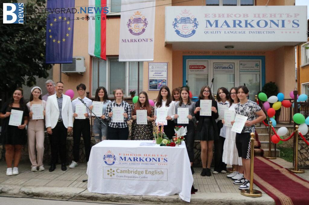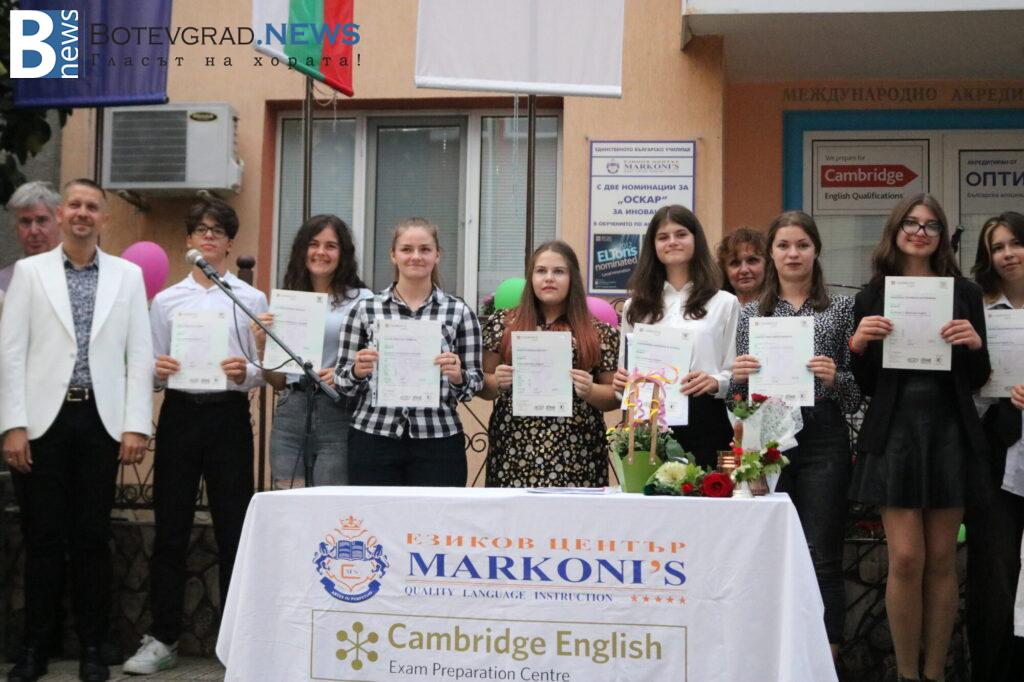 След това управителят, д-р Николай Николов, удари първия училищен звънец. Учениците от най-високите нива получиха тържествено международно признатите сертификати от Университета Кеймбридж, които достойно защитиха през изминалата учебна година. Сертификатите на Университета Кеймбридж бяха връчени от управителя на Езиков център „Марконис“, д-р Николай Николов.