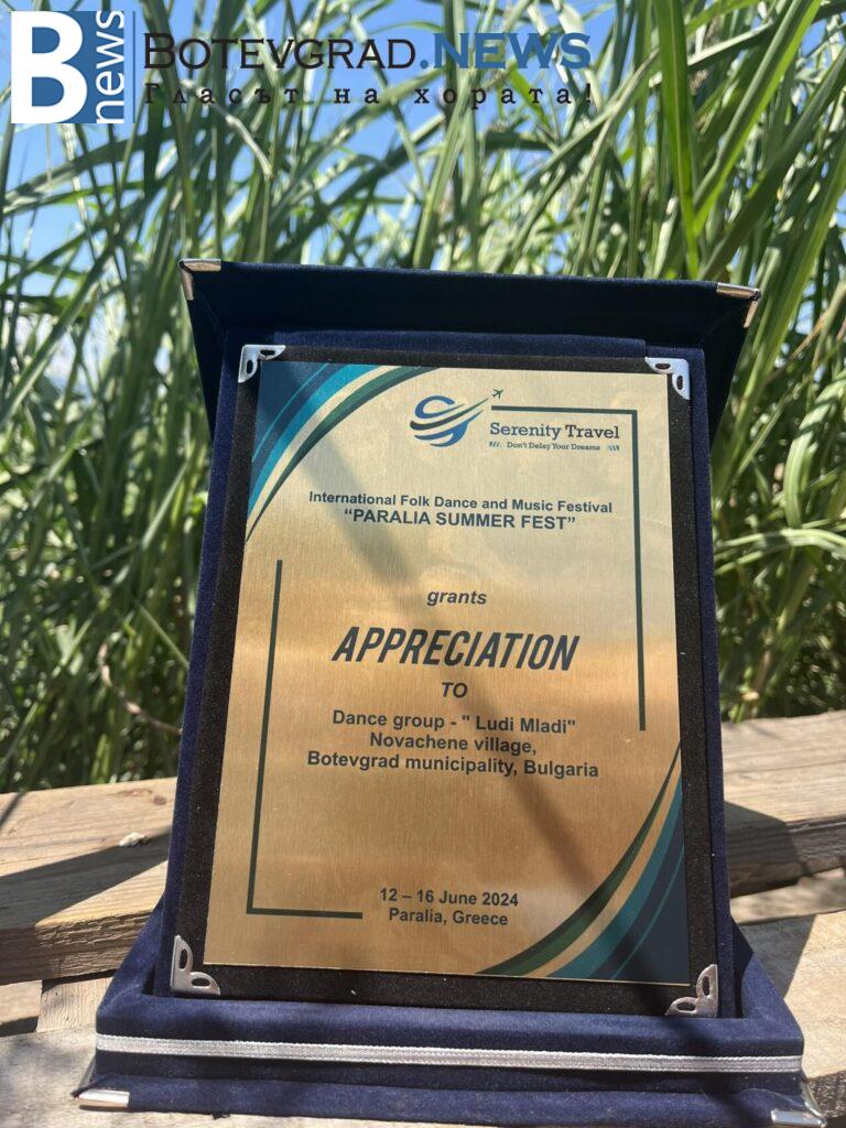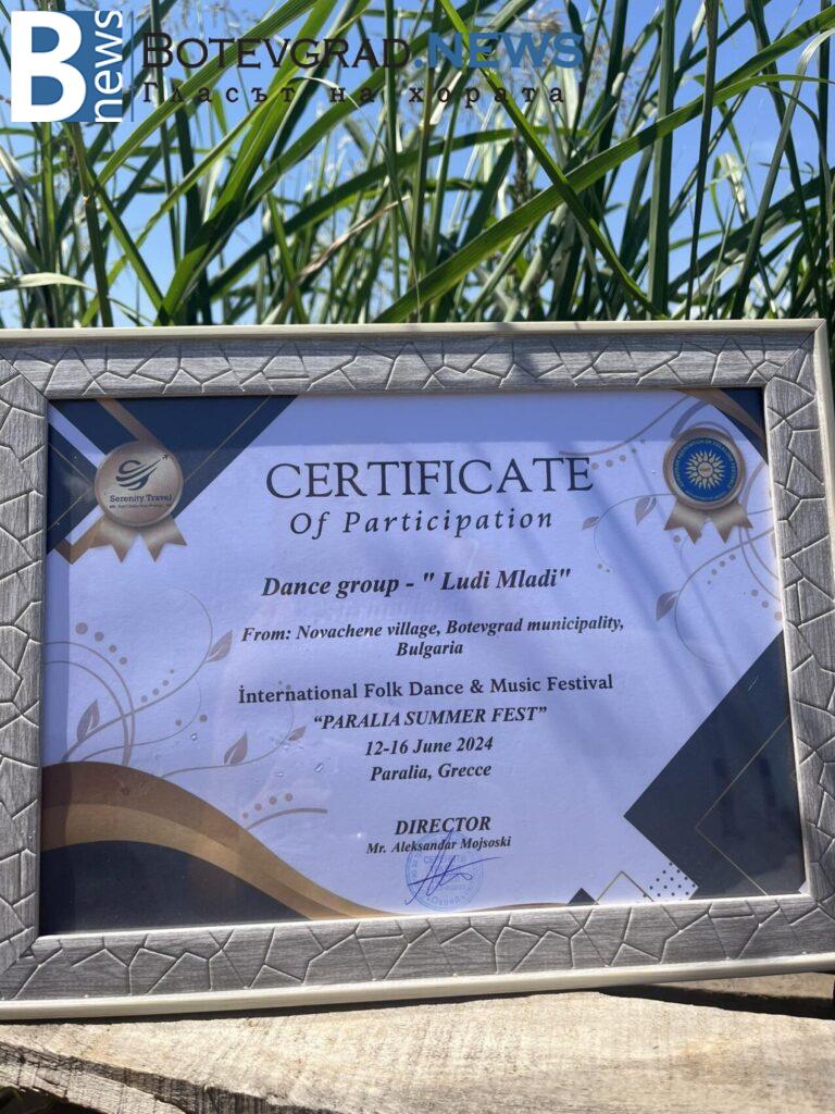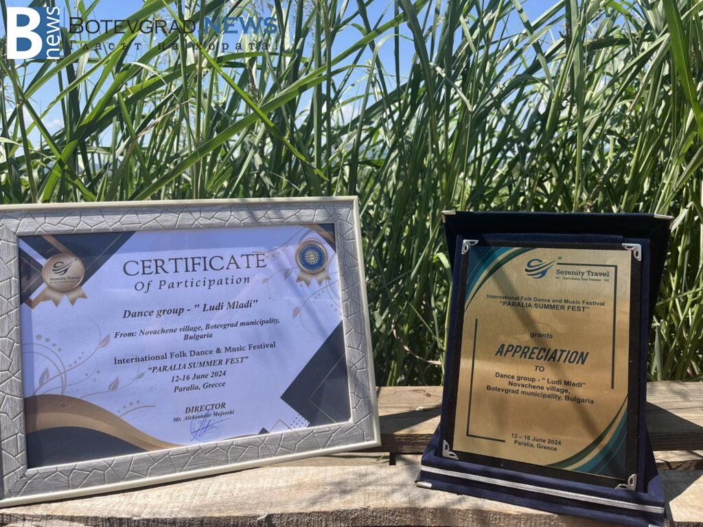 Танцов състав „Луди-млади“ с.Новачене с плакет и сертификат от международен фестивал