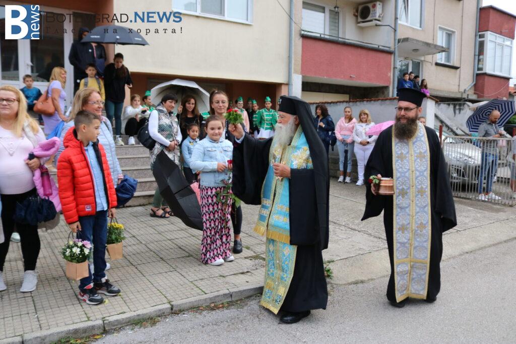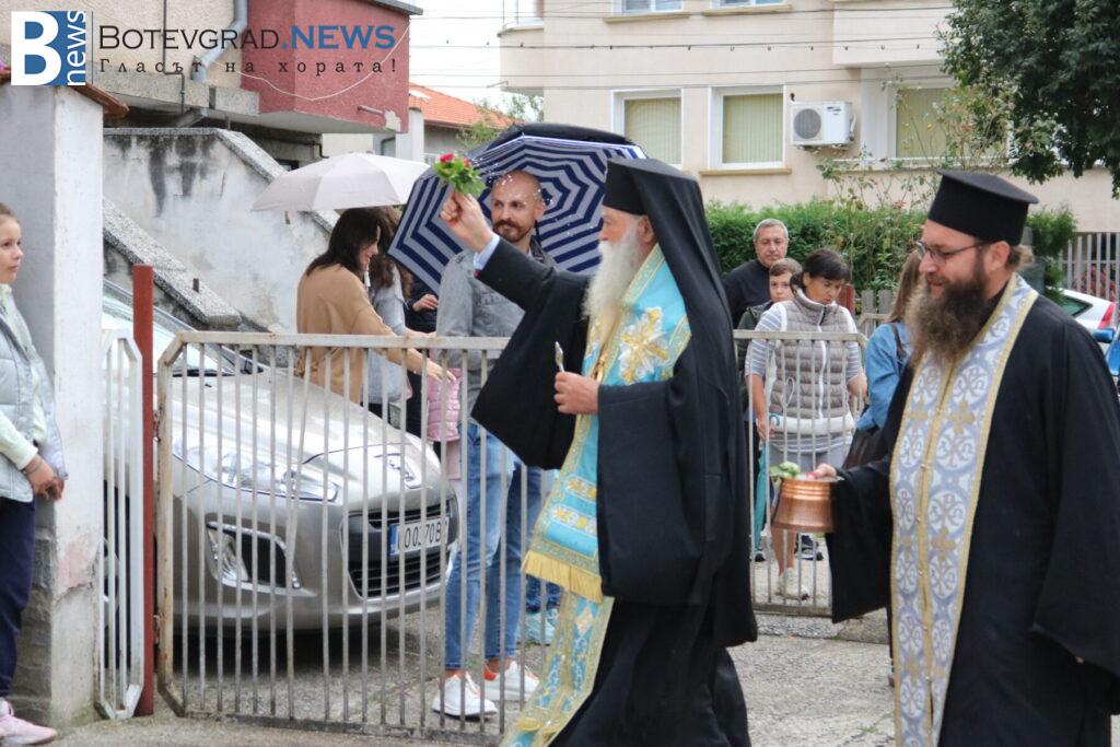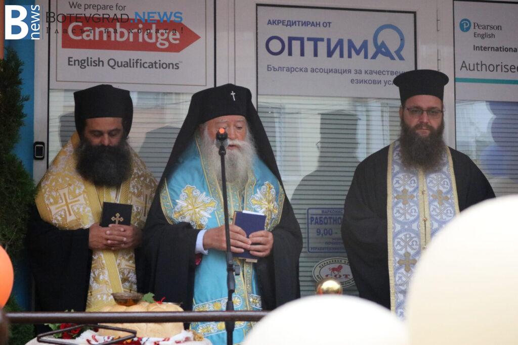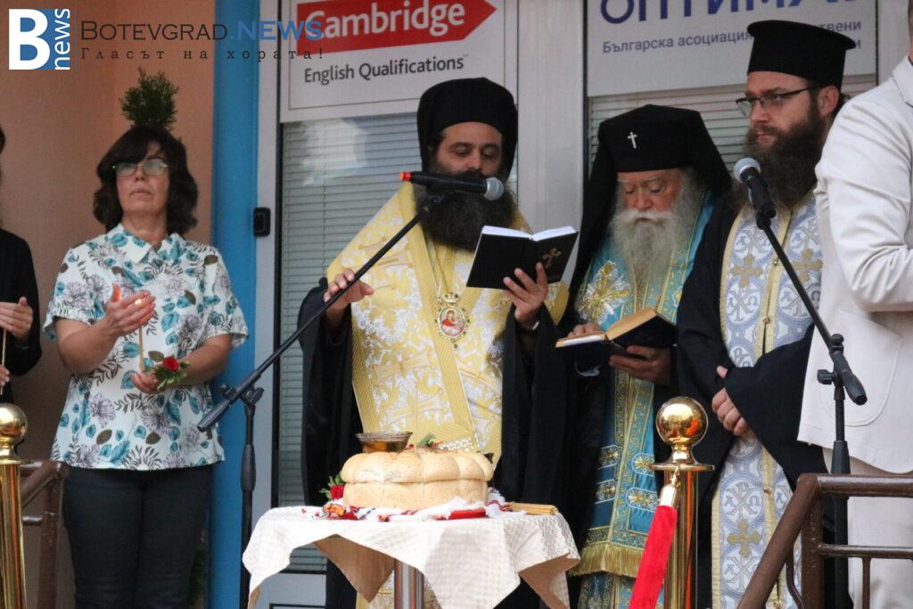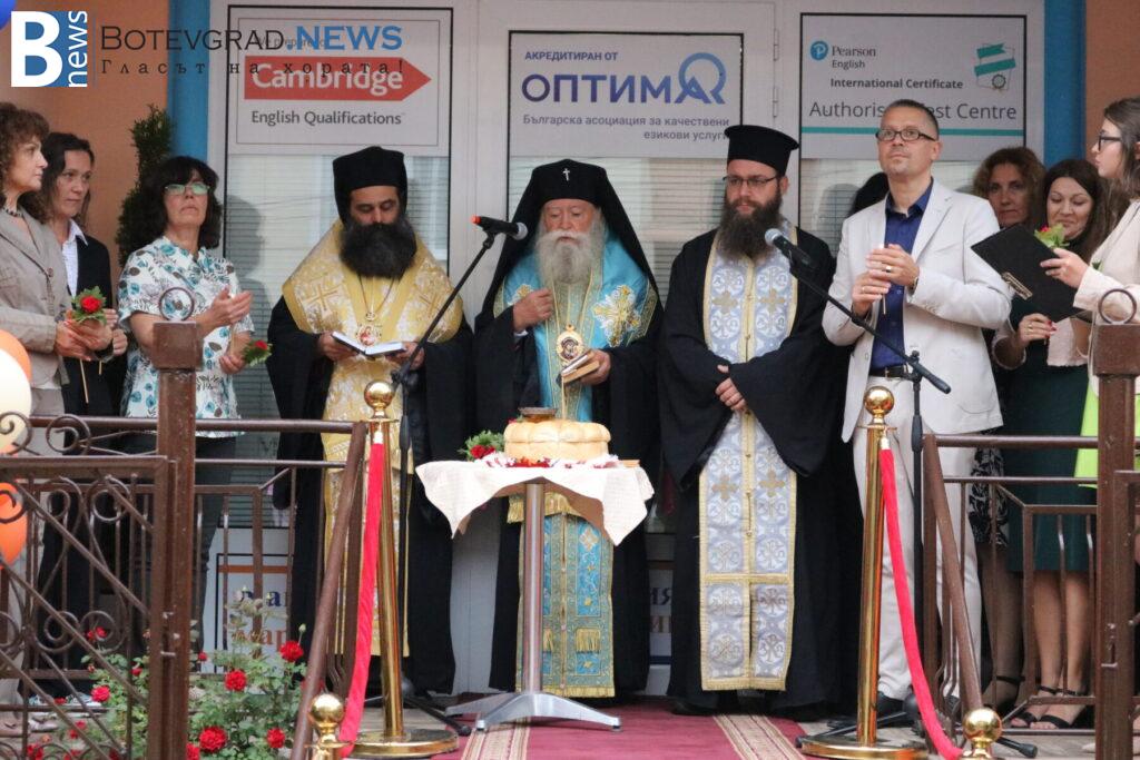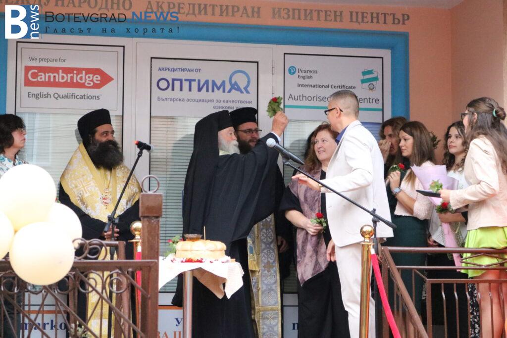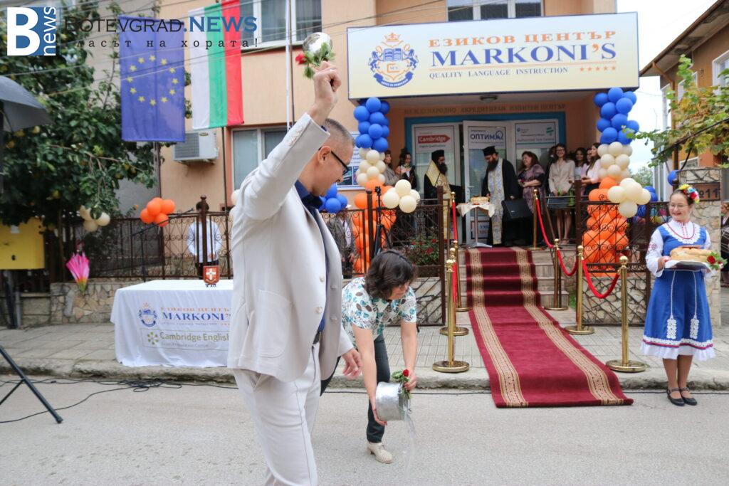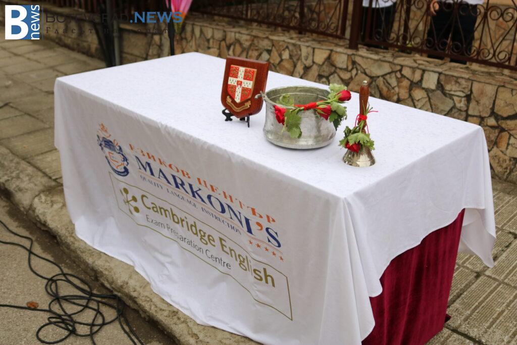 Последва представяне на педагогическия и непедагогическия състав на Езиковия цнетър и традиционният водосвет за здраве и благополучие, специално за който бяха дошли Негово високопреосвещенство ловчанският митрополит Гавриил, Негово преосвещенство епископ Михаил Константийски и Негово благоговейничество отец Борис, които осветиха и знамената на България, на Европейския съюз и на Езиков център „Марконис“, след което последва тържественото им издигане.