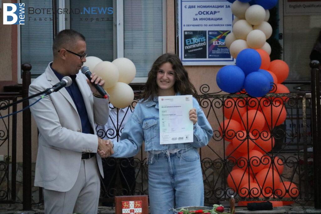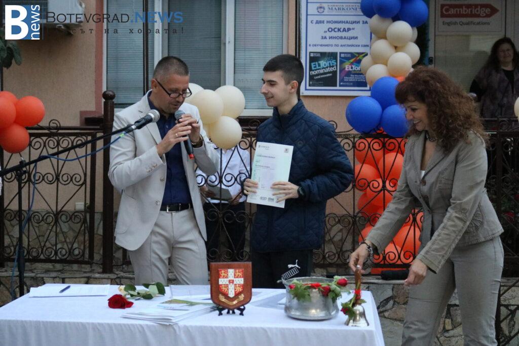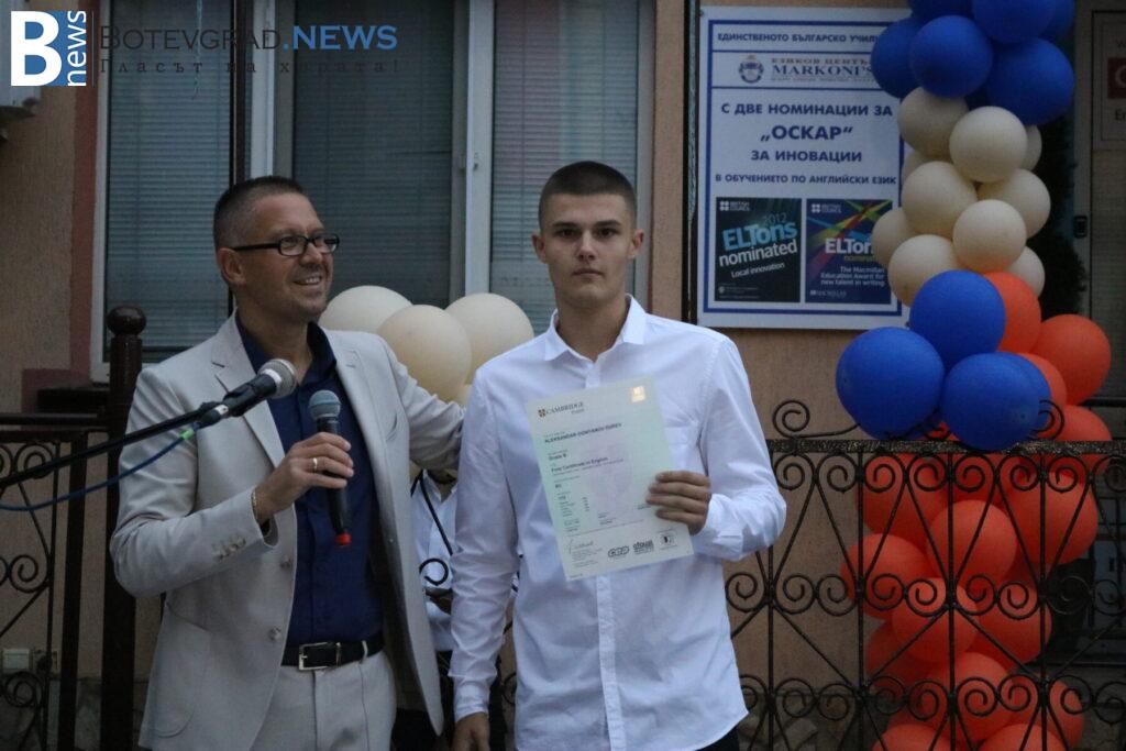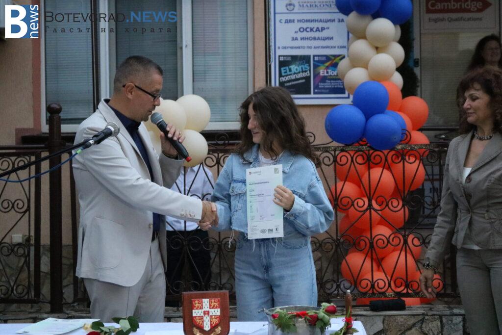 В края на церемонията бяха връчени сертификатите от университета Кеймбридж на учениците, които са се явили тази година на изпитите PET, FCE, CAE, CPE – изпити от най-високите нива според общата Европейска езикова рамка. Освен сертификатите и специални поздравления и аплаузи получиха две от възпитаничките на „Марконис“, които получиха сертификат за най-високото ниво C2. Това бяха Надежда Катеринкина и Цвета Диловска.
