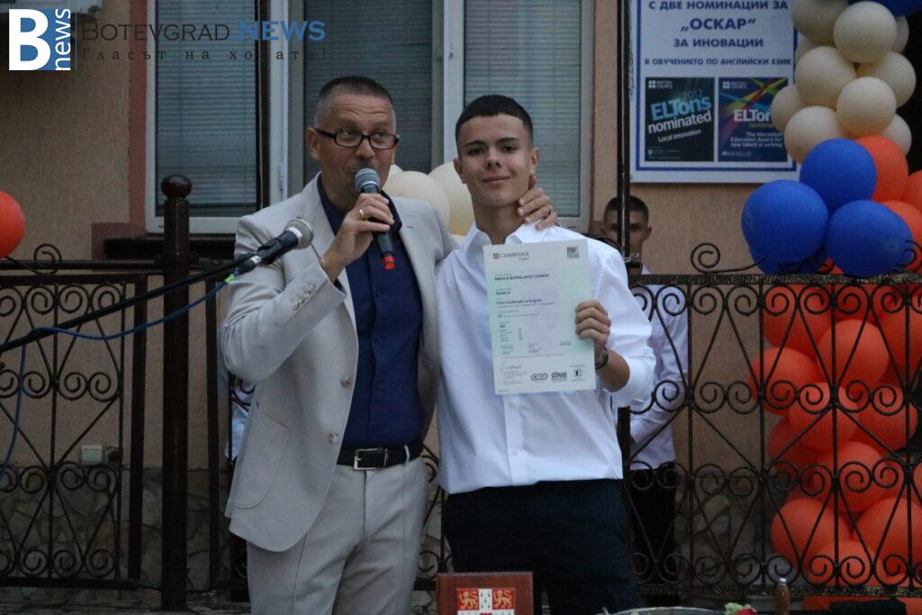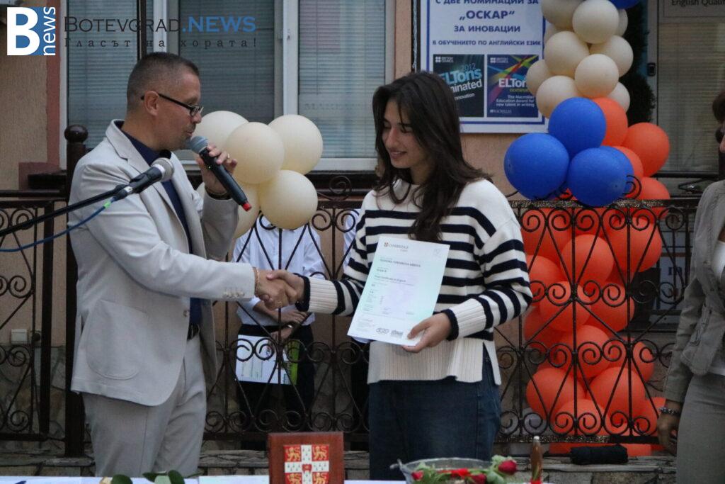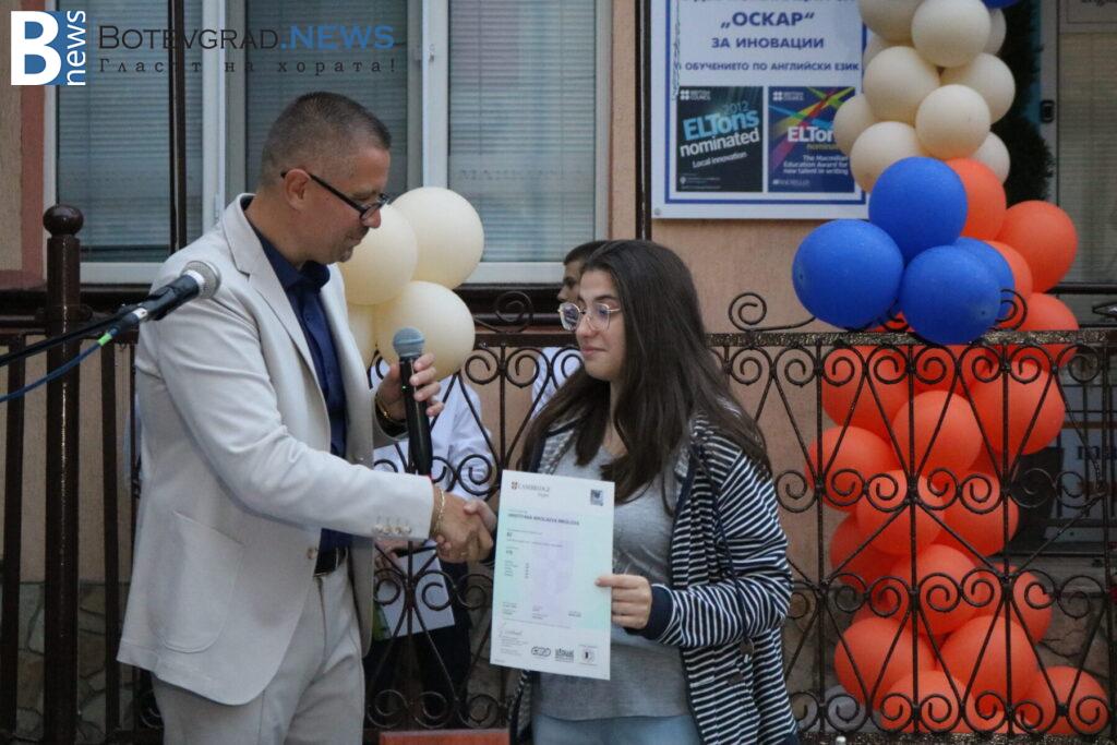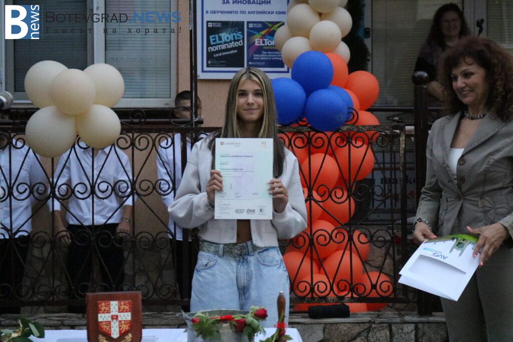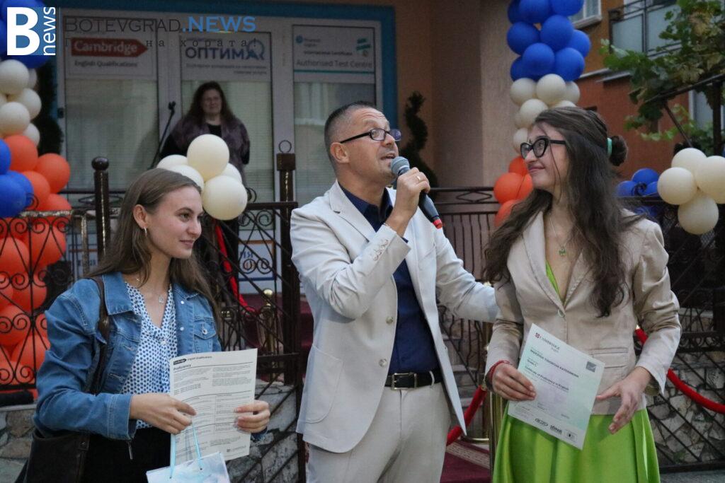 В края на церемонията бяха връчени сертификатите от университета Кеймбридж на учениците, които са се явили тази година на изпитите PET, FCE, CAE, CPE – изпити от най-високите нива според общата Европейска езикова рамка. Освен сертификатите и специални поздравления и аплаузи получиха две от възпитаничките на „Марконис“, които получиха сертификат за най-високото ниво C2. Това бяха Надежда Катеринкина и Цвета Диловска.