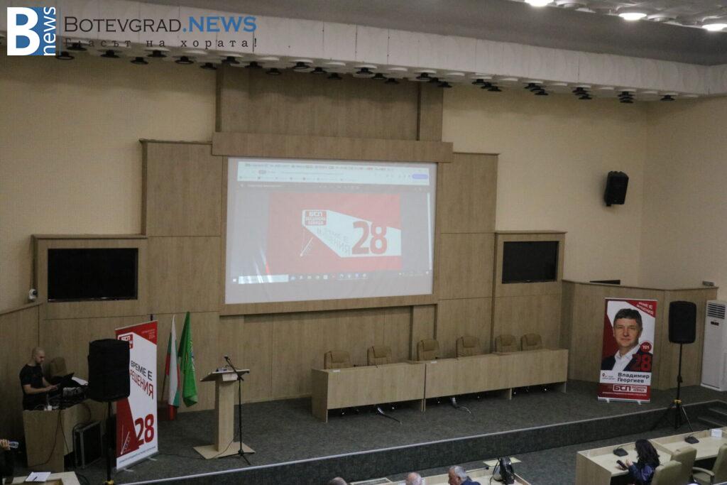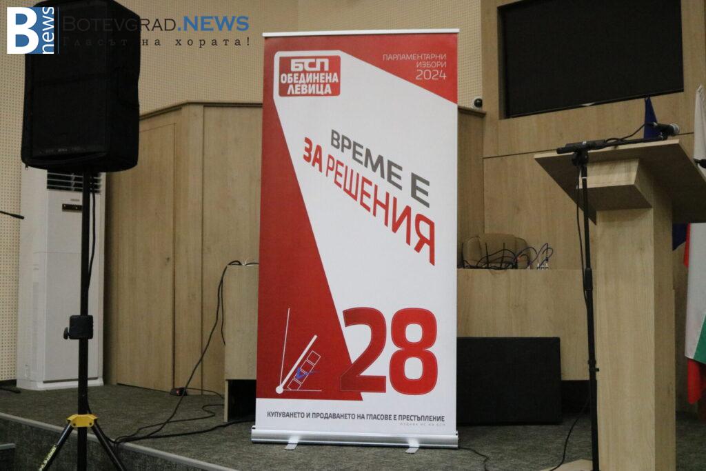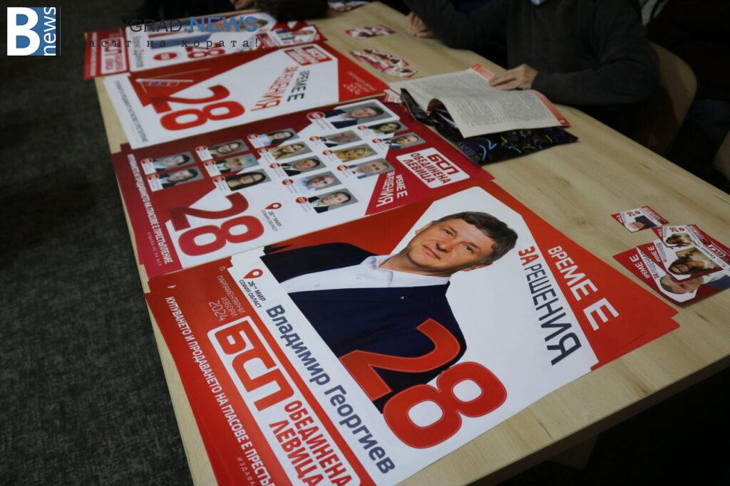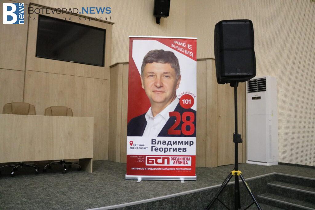На предизборната среща присъстваха кандидатите за народни представители от коалицията, както и водачът на листата в 26 МИР, Владимир Георгиев. „Защо има толкова малка избирателна активност! Защото хората не са доволни от политиците! Лидерите на коалиционните партньори в „БСП-Обединена Левица“ показаха, че България може да върви напред само с общи усилия. Аз се надавам този прочит да се разбере не само от симпатизанти , от левите хора в България, но и от всички останали!“, каза Георгиев. По думите му лидерите на тези партии разчетоха гласа на народа, че той иска нови лица.“ Затова ние всички тук сме кандидати за първи път. От 31 многомандатни избирателни райони в 20 водачите на листи коалицията участват за първи път.“, заяви Владимир Георгиев. Той посочи, че основния проблем в България е този, че държавата не се грижи за младите хора, да получават по-добро и качествено образование в България, с по-добри стипендии, да усещат подкрепа, когато започват работа. „Нашата цел е те да не бягат зад граница за по-добри възнаграждения, а да останат в България, да усещат подкрепата за първо дете – хил.лв., за второ дете – 10 хил.лв., да се увеличи размера на майчинството, да усетят, че могат да си осигурят дом. Тези, които досега ни управляваха и казват сега какво ще направят, не са мислили всичко това“, подчерта водачът на листата, Владимир Георгиев. По думите му протестният вот на българите ще бъде, ако излезнат и масово гласуват и призова да изберат бюлетина №28 .