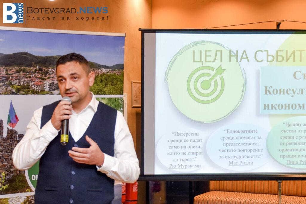 Г-н Александров представи подробна презентация пред своите гости и подробно разясни необходимостта от създаване на консултативен съвет за икономическо развитие, в който да има по един представител от всяка област – производство, търговия, услуги, здраве и занаяти. Функциите на този съвет ще бъдат насочени към подпомагане на икономическото им развитие, създаване на взаимно доверие и партньорство, да координира взаимодействието между бизнеса и местната власт и да консултира и прави препоръки по отношение оптимизиране на местните данъци и такси. Благодарение на консултативният съвет ще се създаде и непосредствен и системен контакт с местния бизнес по проблемите на икономическото развитие на общината и подобряване на връзката местна власт и бизнес.