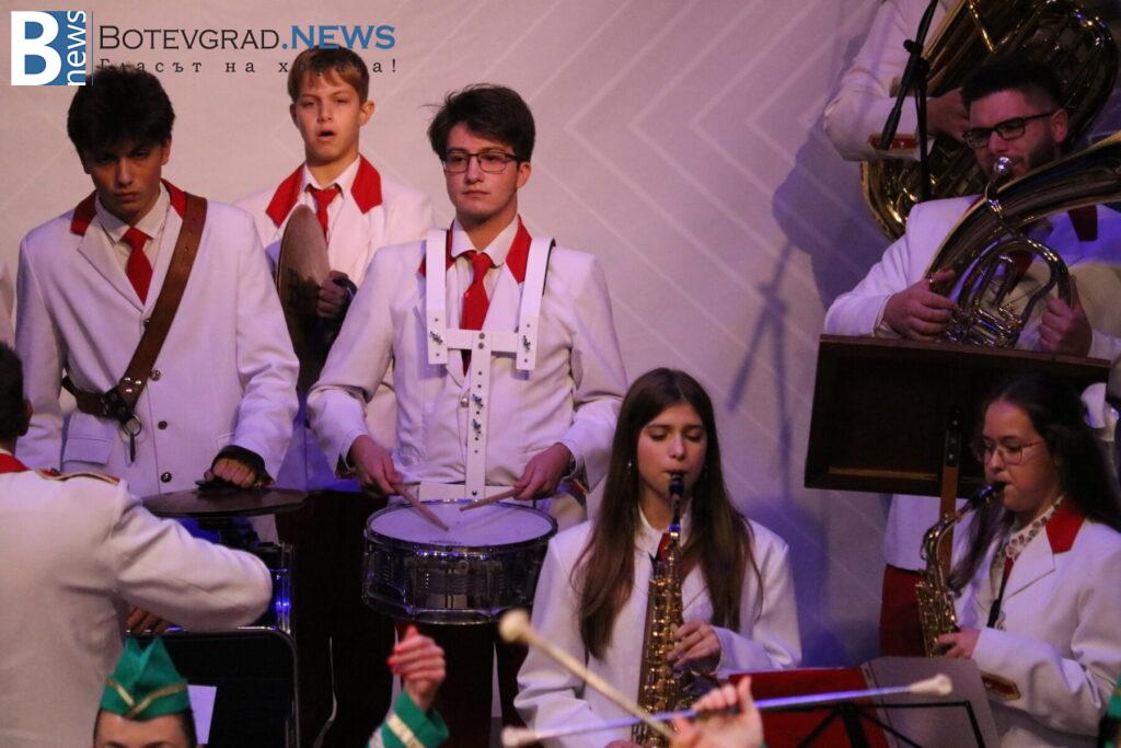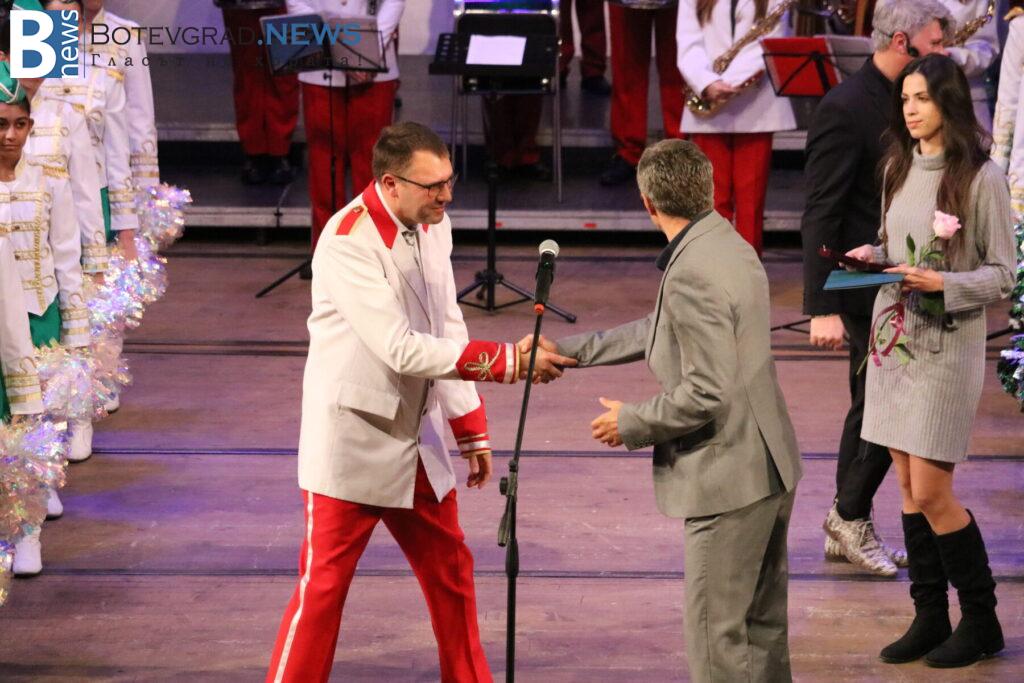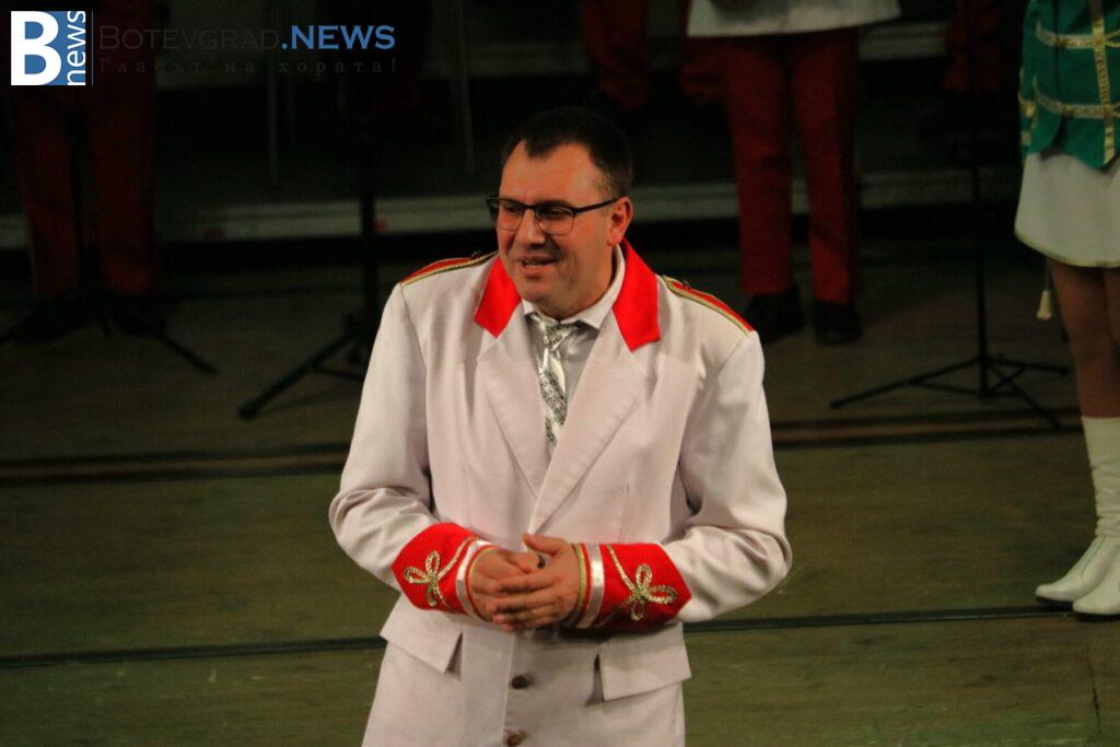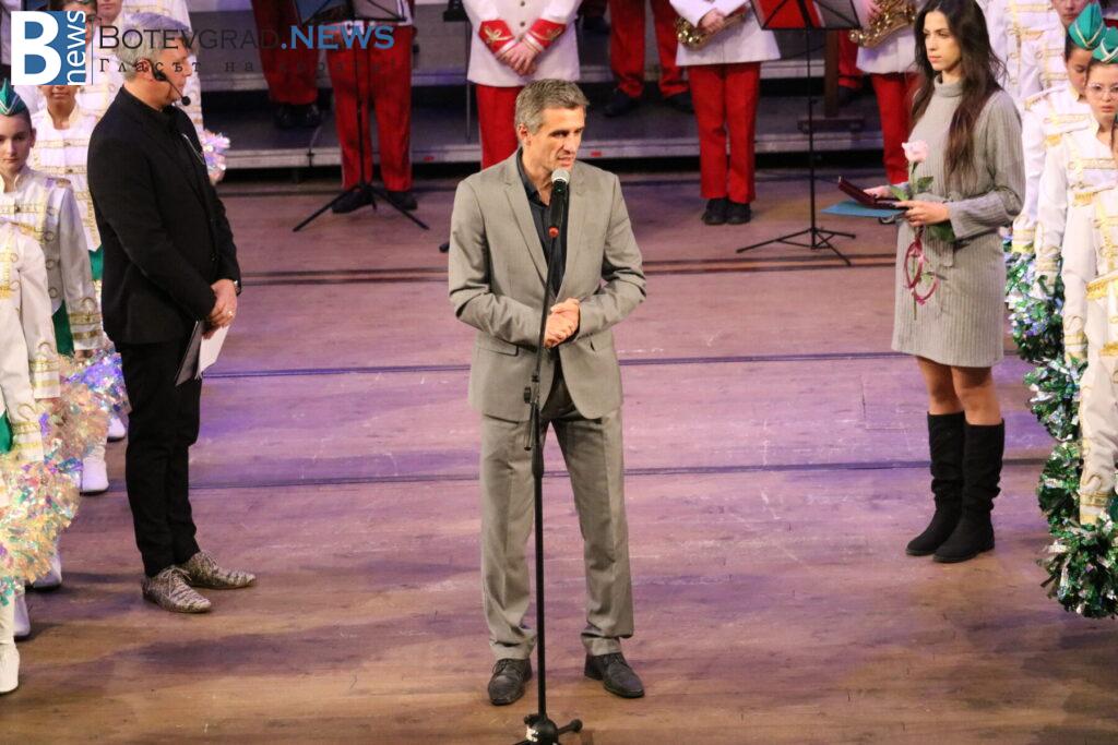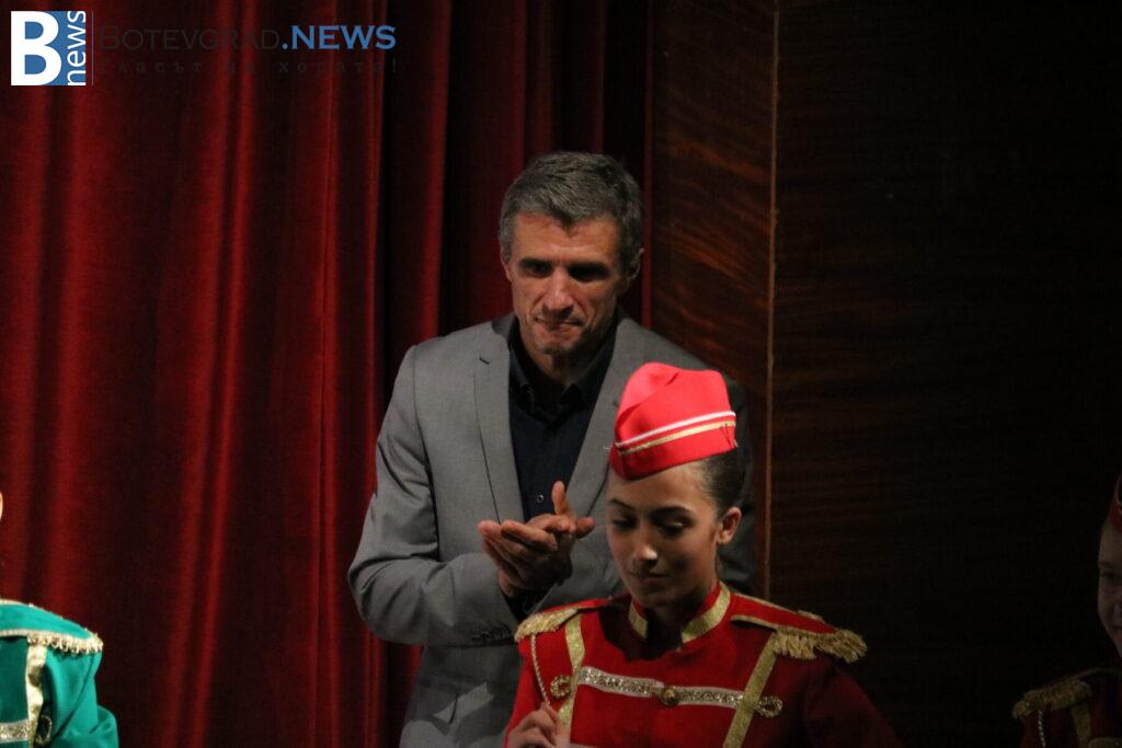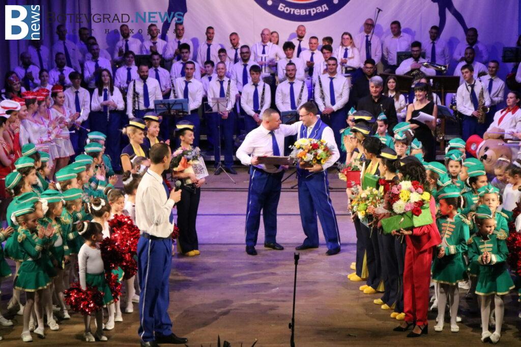 „За мен е изключителна отговорност и удоволствие да присъствам на този юбилей, 60 години от създаването на младежки духов оркестър и 20 години от създаването на мажоретен състав. Искам да изразя своята лична благодарност и признателност към ръководителите на тези два състава. Към всички участници, бивши и настоящи им благодаря, че по един изключително достоен начин представят града ни. За мен е удоволствие да наградя макар и символично с почетен плакет от Община Ботевград, ръководителя на младежкия духов оркестър Константин Гайдарски. Много благодаря за положените усилия през годините. Огромно удоволствие е да поздравя и Иванка Христова ръководител на младежкия мажоретен състав. Със своята любов, с която върши работата си, с това че успя да събере толкова момичета от нашия град и от нашата община, да им покаже красотата на това изкуство, което те сътворяват, да ги мотивира да се трудят всеки ден и наистина да представят по един изключително достоен и особено красив начин младежта, любовта и духа на нашия град. Поздравления още веднъж“ – с тези думи кмета на Община Ботевград – Иван Гавалюгов поздрави Константин Гайдарски и Иванка Христова.