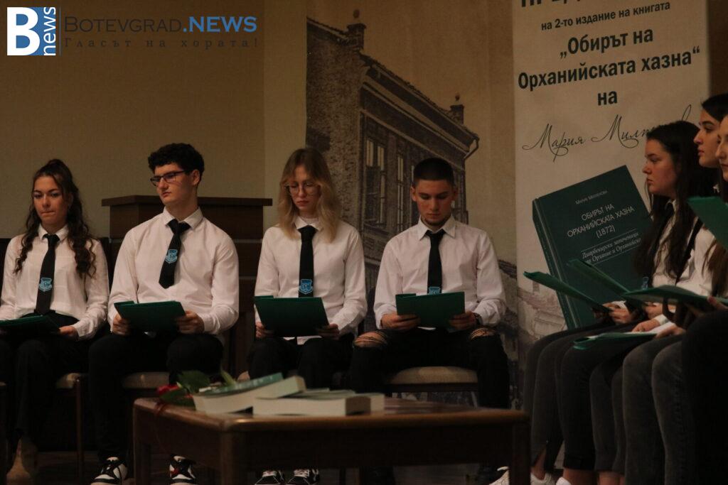„За мен е чест, че точно учениците от 11 б клас на ботевградската гимназия са виновниците за осъществяването на това събитие, точно при издаването на книгата „Обирът на Орханийската хазна“. Скъпи съграждани, може би всички критикуваме младото поколение, но пред вас са едни млади, креативни, иновативни и умни хора, за което аз им благодаря. Първи ноември е празник на народните будители и тогава винаги споменаваме учители, художници, автори и други дейци на културата. За мен най-младите будители на Ботевград, това са учениците от ботевградската гимназия. Аз ви гарантирам и ви заявявам, че повече от 80% от учениците в Ботевград са от нашето училище и те доказаха това с участието във всички мероприятия по повод преименуването на Орхание в град Ботевград. Аз се гордея, но зад тези успехи стои колектива от учители, за което също ги поздравявам! За да го направят учениците – зад тях стои един учител, който може да вдъхнови, който е добронамерен, и който показа доверие към своите ученици – госпожа Десислава Ангелова. Благодаря ви! – С тези думи госпожа Даниела Колева – директор на ППМГ „Акад. проф. д-р Асен Златаров“ изказа нейните най-сърдечни благодарности към учениците и класният ръководител на 11 б клас, като сподели , че те ще получат като награда екскурзия до желана от тях дестинация.
