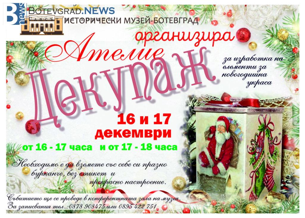 Работа в Ателие „Декупаж“ организира Исторически музей-Ботевград, за изработка на елементи за Новогодишна украса.