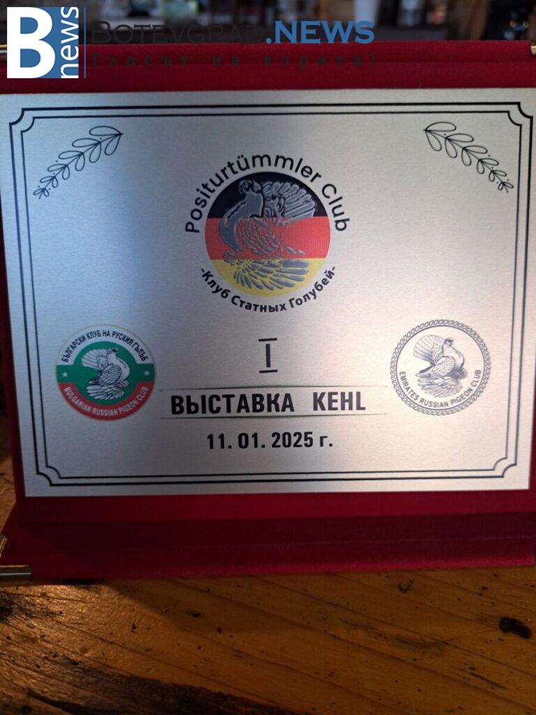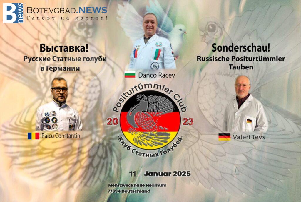 Гълъбовъди от Клуб на руския гълъб в България взеха участие в изложение на руски статен гълъб в немския град Kehl-Neumühl, който се състоя от 10 до 12 януари 2025г. В него участие взеха представители от общините Ботевград, Ловеч, Враца, Тетевен, Сливен, Генерал Тошево, Стара Загора и др. Главен съдия на изложбата бе Данчо Рачев от Ловеч, който сподели, че България има шанса да присъства на едно историческо събитие, в което се променя стандарта в селекцията на руските статни гълъби. Рачев се ползва с международно признание и авторитет сред гълъбовъдите в Европа, Близкия Изток и Азия, като преди година бе главен съдия на изложение на руски гълъби в Дубай. Другите двама съдии на тазгодишната изложба бяха Райку Константин (Румъния) и Валери Тевс (Германия). Главен организатор бе Виталий Хуш, германец с руски произход, който бе създал перфектна организация. Събитието бе уважено от Александър Седов – председател на гълъбовъдите в Русия, Андрей Карле – дългогодишен селекционер на руски гълъби от Русия, живеещ в Германия, международният съдия Паскал Крепс от Франция, както и много други знакови селекционери от Русия и Европа.