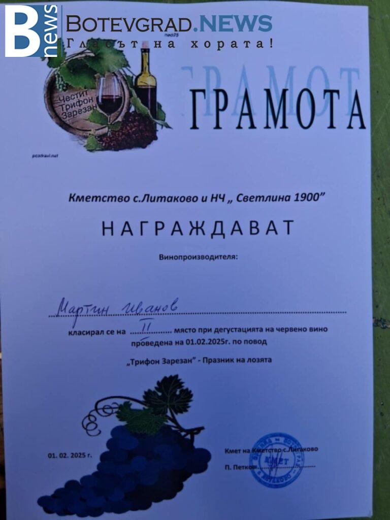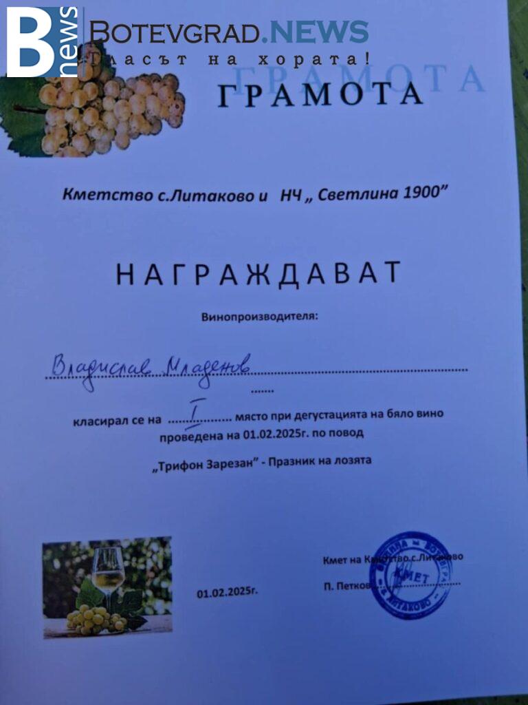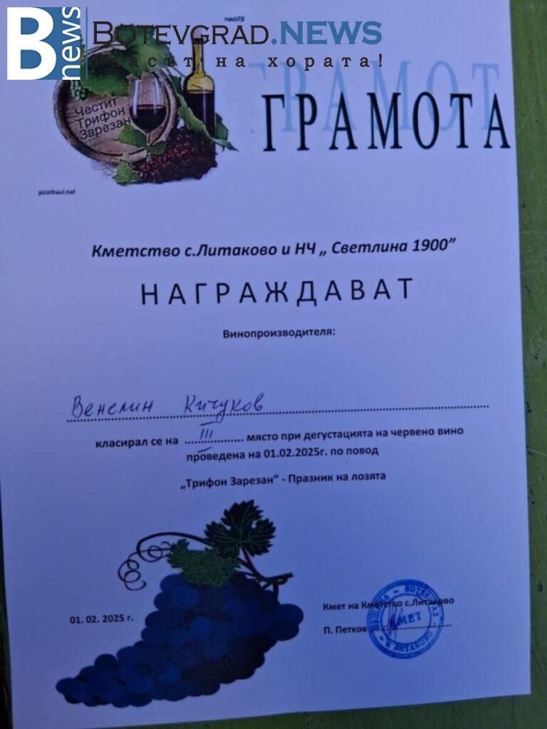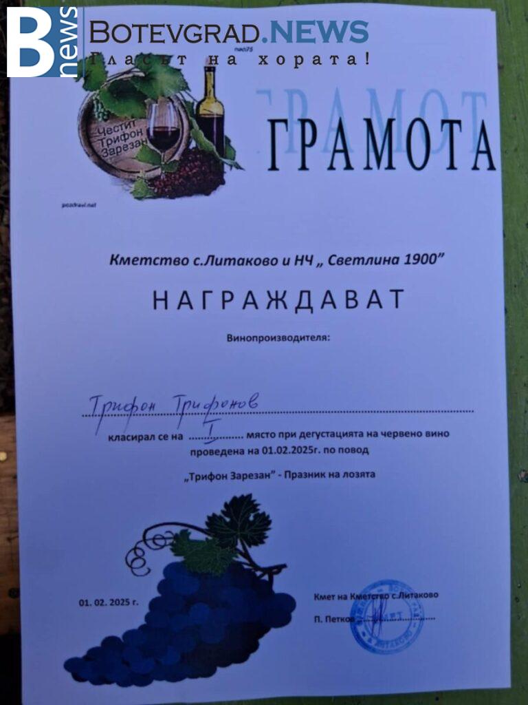 Компетентното жури присъди шест награди. Комисията награди винопроизводителя Трифон Трифонов с първо място при дегустация на червено вино. На второ място – Мартин Иванов, трето място – Венелин Кичуков. В дегустацията на бяло вино, първо място получи Владислав Младенов. По традиция млади момичета, раздават питка, в която се крие паричка. Тази година тя се падна на Николета Петкова, която стана царица на лозята. Заедно с царя на виното- Трифон Трифонов, по традиция зарязаха лозята .