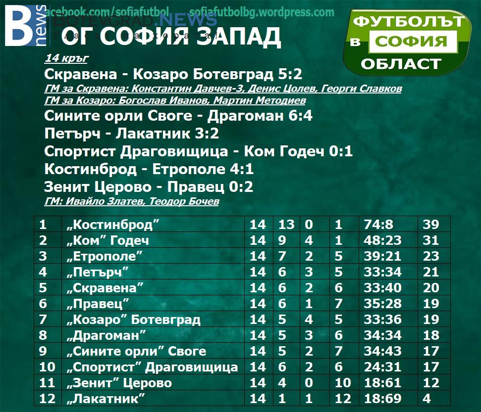С успеха Костинброд вече има 39 точки, с цели 8 повече от втория Ком Годеч. Етрополе е на третата позиция с 23 пункта.