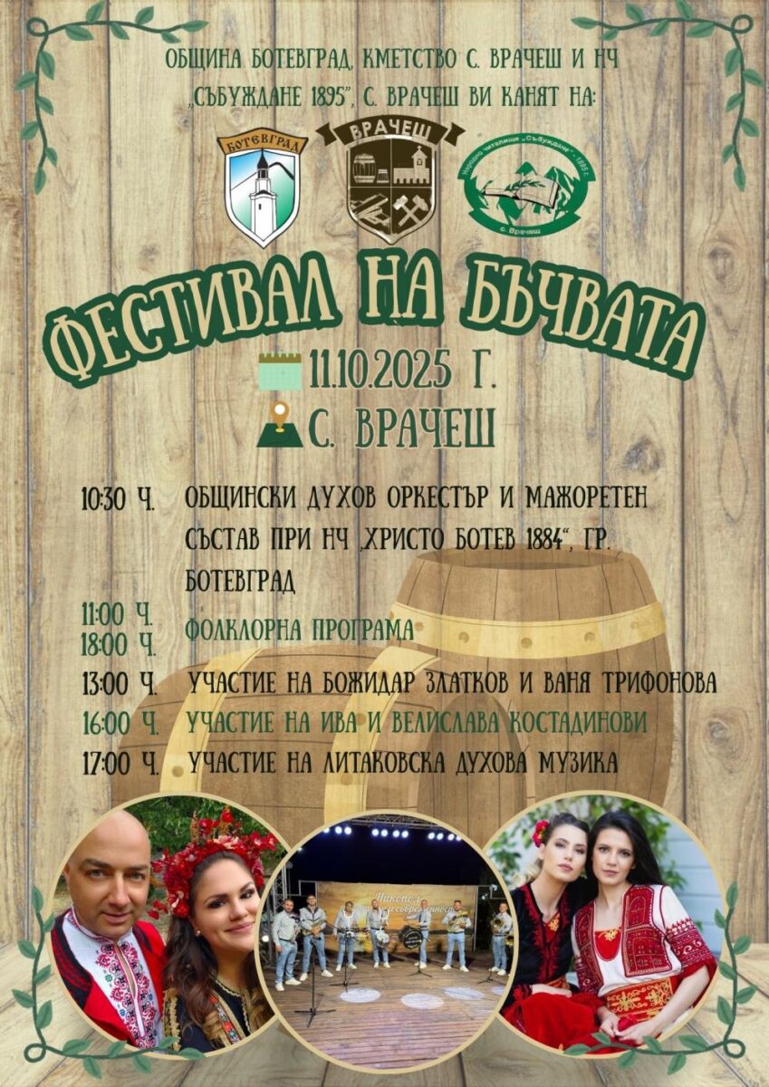 Община Ботевград, Кметство с. Врачеш и Народно читалище „Събуждане 1895“, с. Врачеш, канят всички жители и гости на района на традиционния „Фестивал на бъчвата“, който ще се проведе на 11 октомври 2025 г. в село Врачеш.