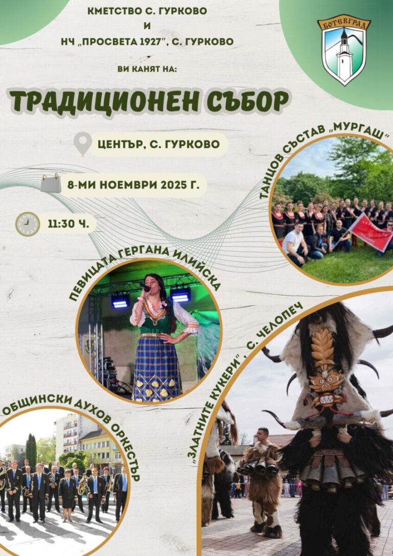 На 8 ноември 2025 г. (събота) от 11:30 ч. в центъра на село Гурково ще се проведе дългоочакваният Традиционен събор...