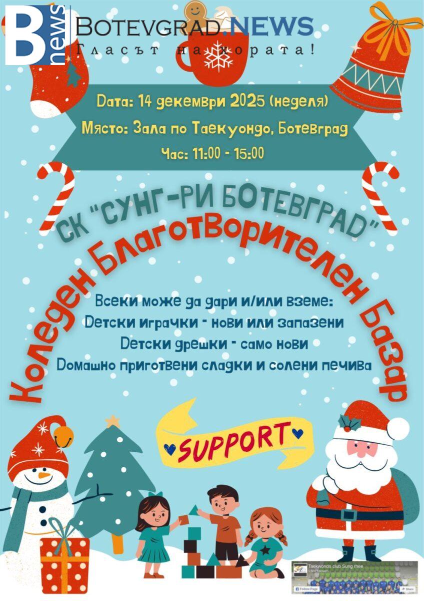 Ботевградският клуб по таекуондо „Сунг Ри“ за поредна година ще проведе Благотворителен Коледен базар. Тази година инициативата ще се състои на 14 декември (неделя) в залата по таекуондо, Ботевград,от 11.00 до 15.00 .