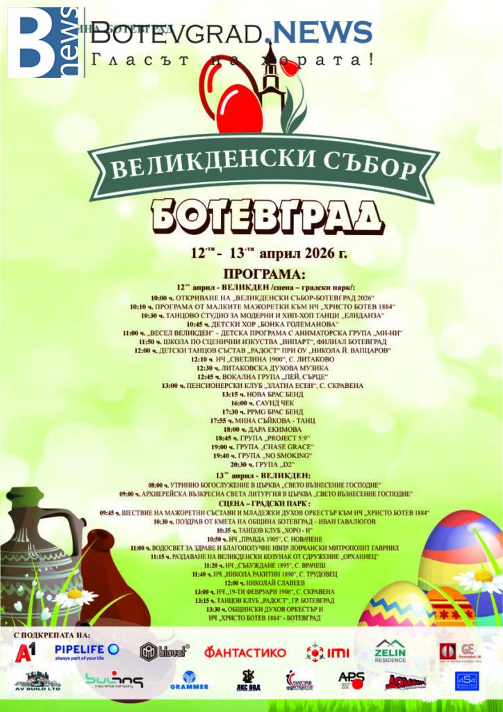 Община Ботевград кани жителите и гостите на града на деветото издание на „Великденски събор – Ботевград 2026“, което ще се проведе на 12 и 13 април 2026 г. в Градския парк.