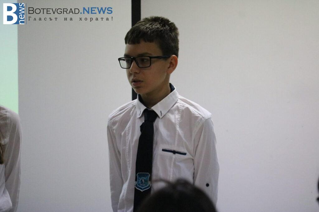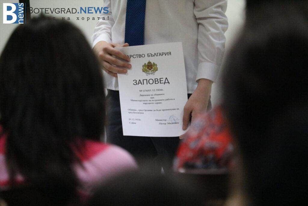 Седмокласниците пресъздадоха моменти от общоградското събрание за избор на ново име на града ни начело с кмета Иван Савов, в което се чуха предложения за запазване на името Орхание и Зелин, преименуване на Йоанинград и Вишневград, до предложението на Асен Златаров за Ботевград заради откритите и положени в църквата в с.Скравена през 1930г. черепи на 10 Ботеви четници и почитта на населението към подвига и делото на поета-раволюционер и неговата чета.