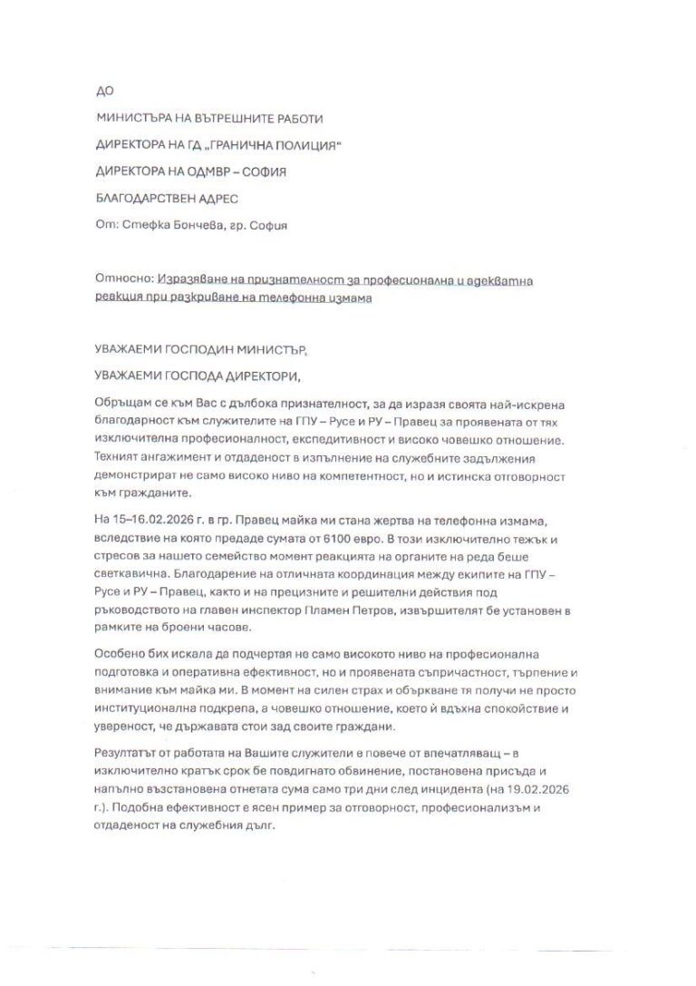 Г-жа Стефка Бончева изказва искрена благодарност към служителите на РУ-Правец и ГПУ-Русе за бързите им съвместни професионални действия, експедитивност и...