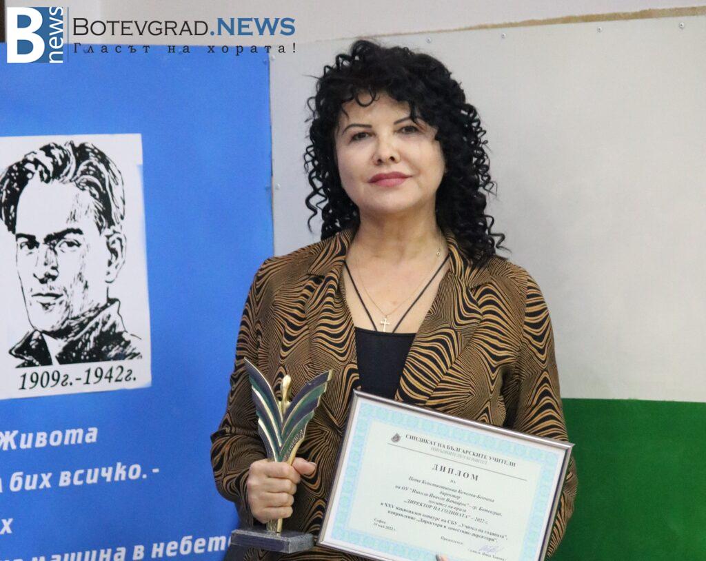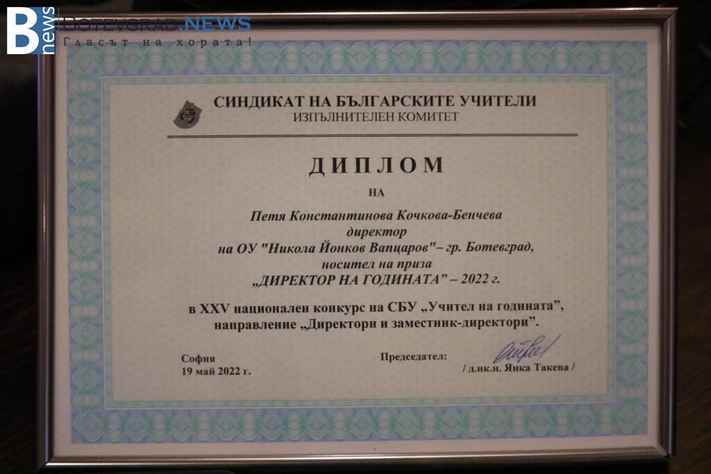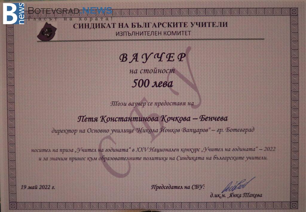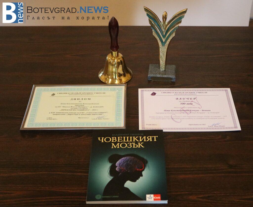 Директорът на ОУ“Никола Йонков Вапцаров“ бе удостоена с Диплом, статуетка, ваучер на стойност 500 лв – за обучение, училищен звънец, с книгата на Владимир Овчаров – „Човешкият мозък“ и раница.