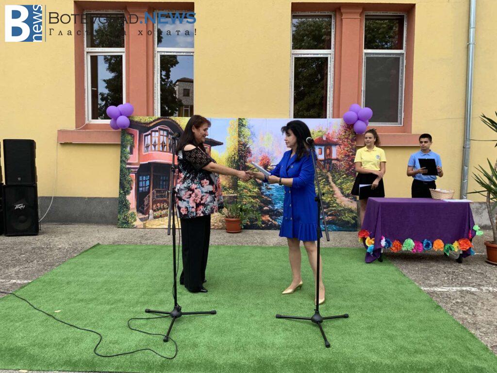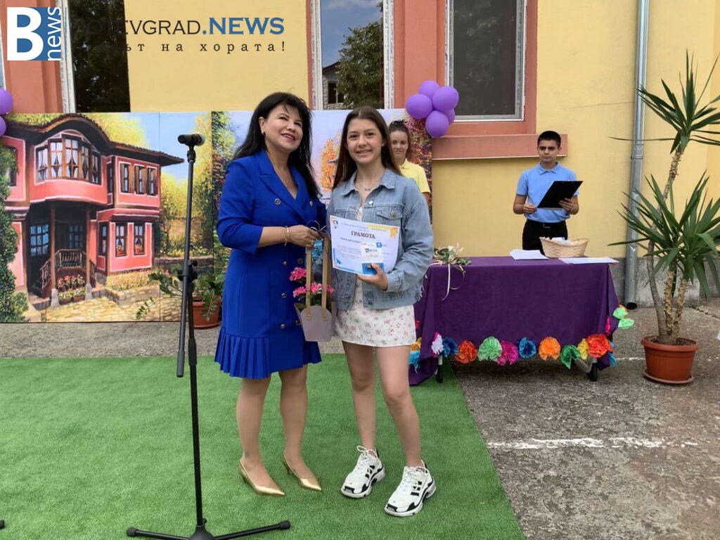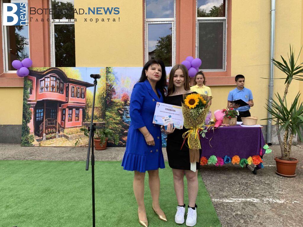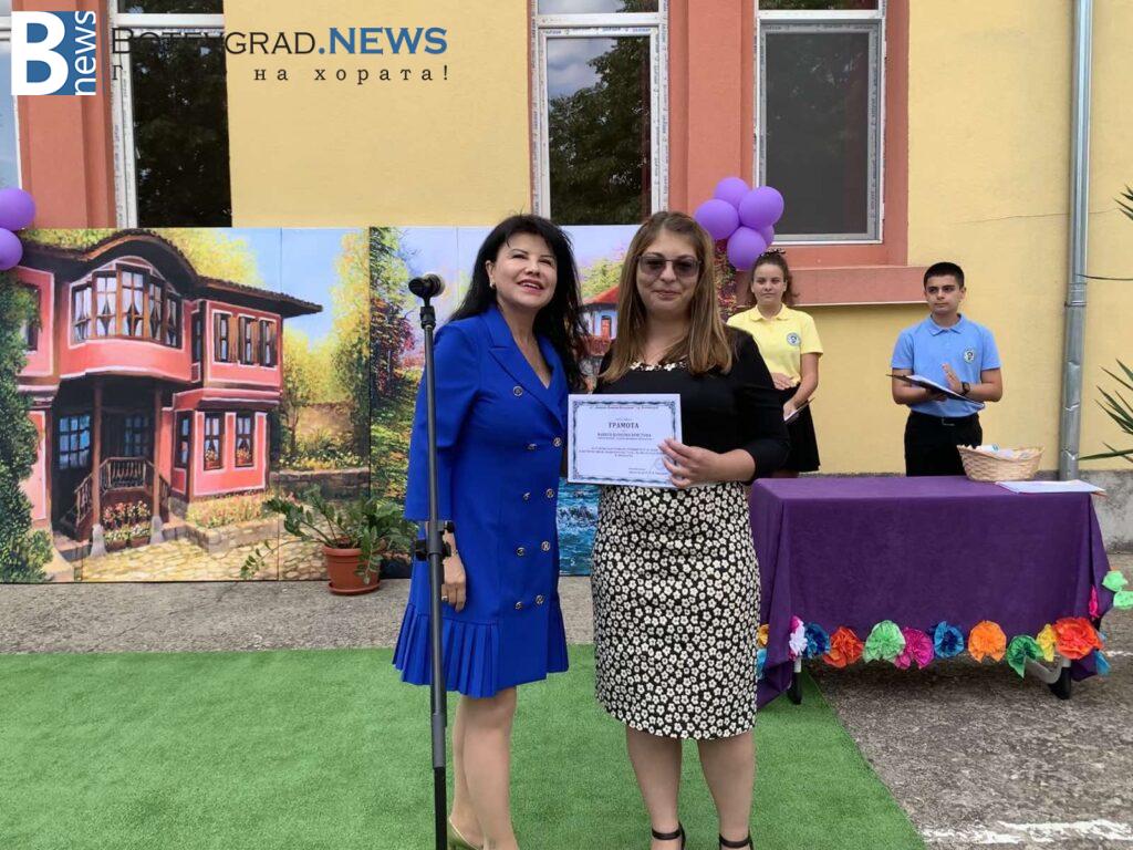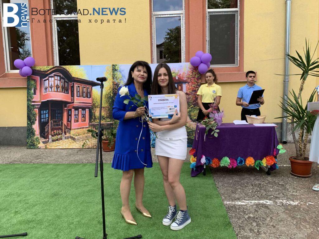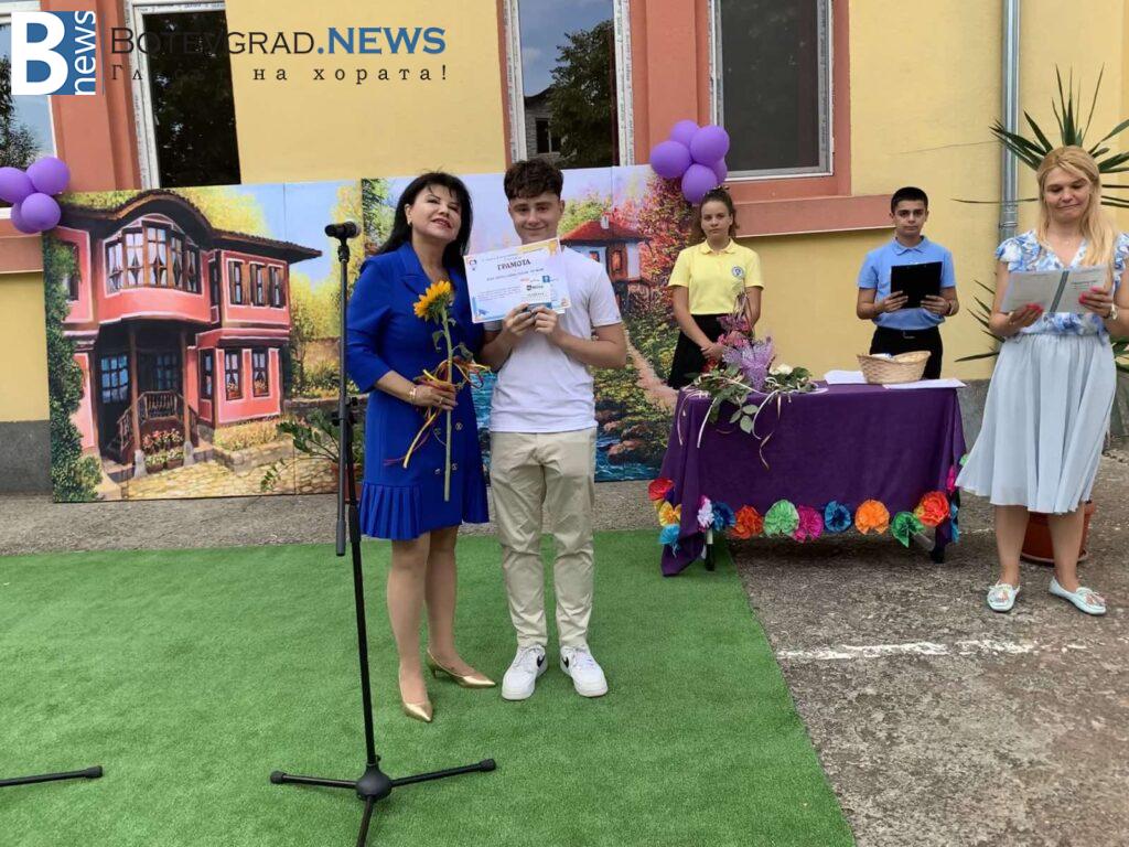 Г-жа Кочкова връчи грамота за отлична подготовка на учениците за НВО и постигнат висок резултат на учителите г-жа Бисерка Петкова – главен учител и преподавател по математика и на г-жа Ванеса Христова – учител по БЕЛ. Последва връчване на грамоти на ученици за постигнат отличен успех и висок резултат на двете матури, както следва: