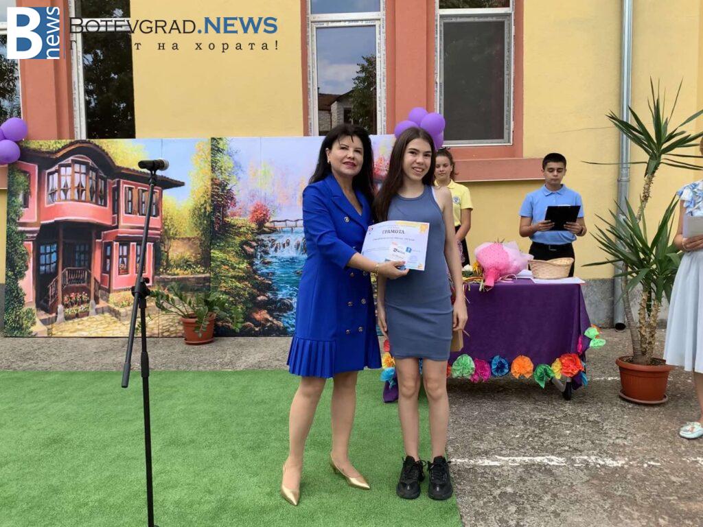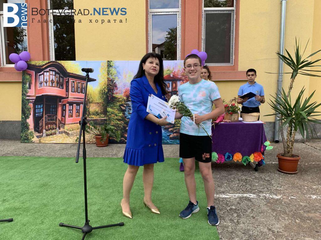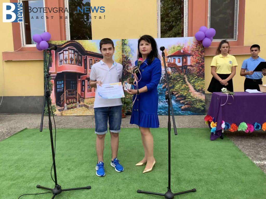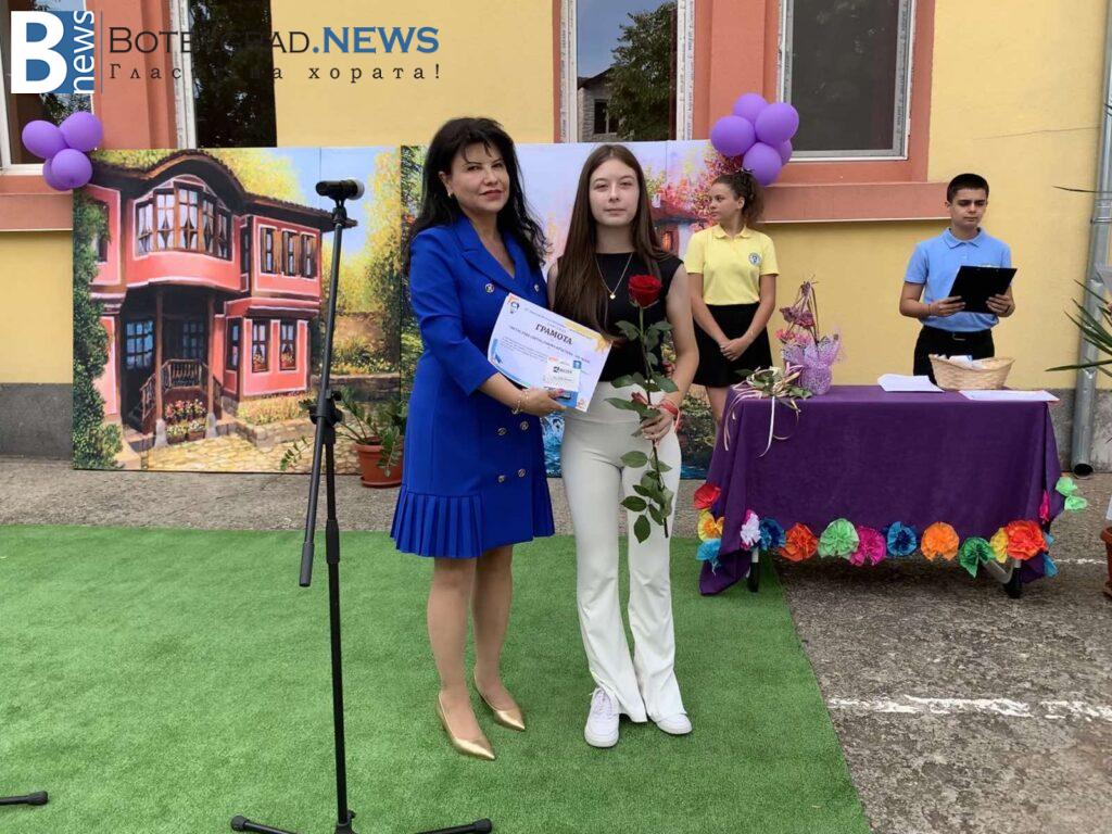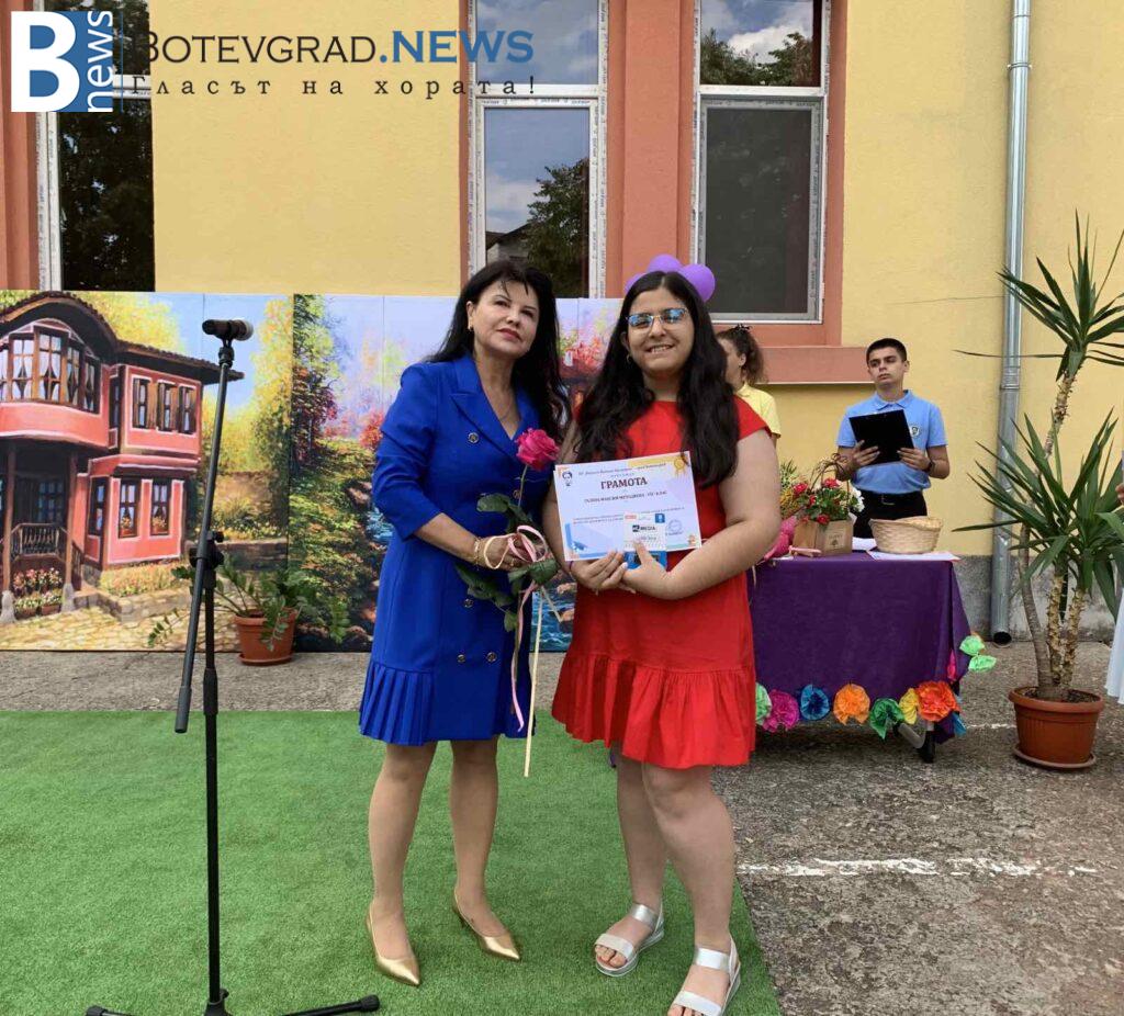 Г-жа Кочкова връчи грамота за отлична подготовка на учениците за НВО и постигнат висок резултат на учителите г-жа Бисерка Петкова – главен учител и преподавател по математика и на г-жа Ванеса Христова – учител по БЕЛ. Последва връчване на грамоти на ученици за постигнат отличен успех и висок резултат на двете матури, както следва: