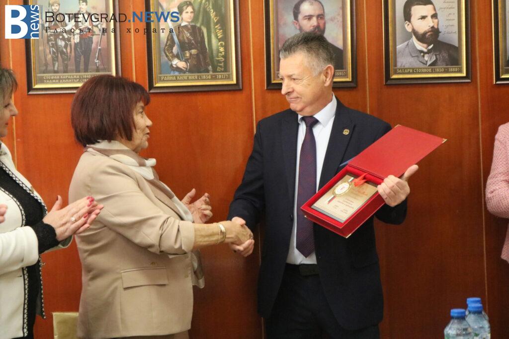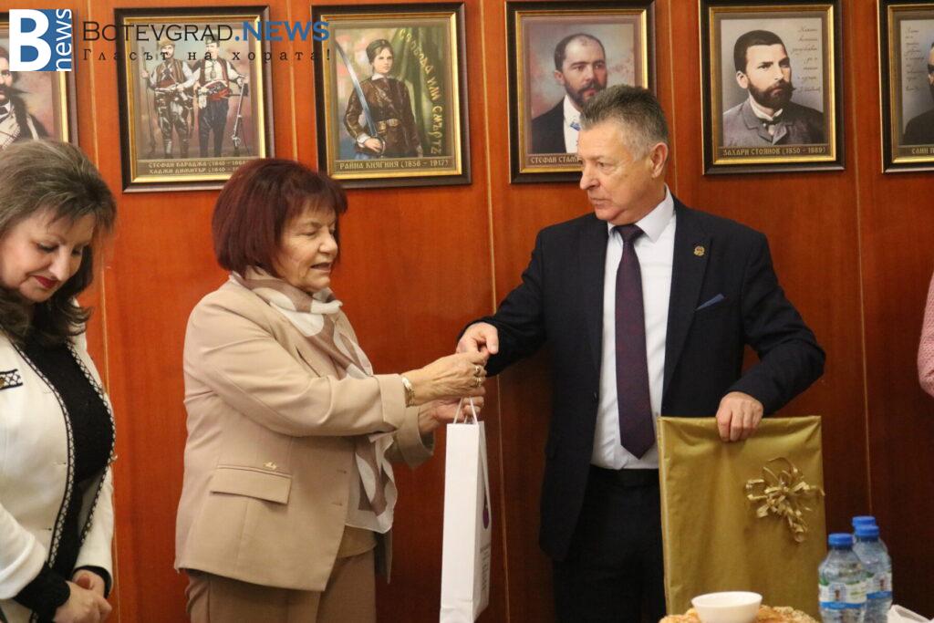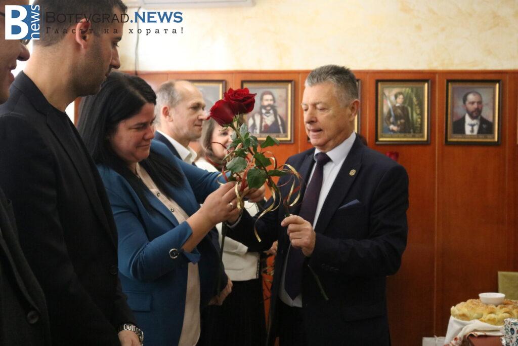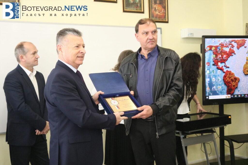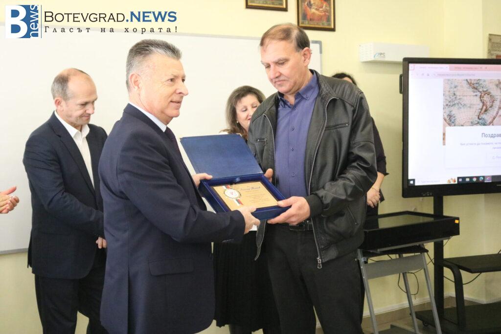 Директорът връчи на Лъчезар Петков плакет за неговия принос в изработването на стенопис, в новия кабинет.