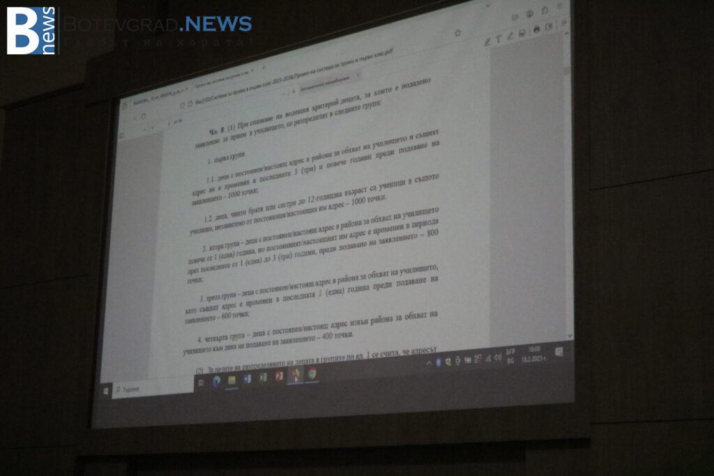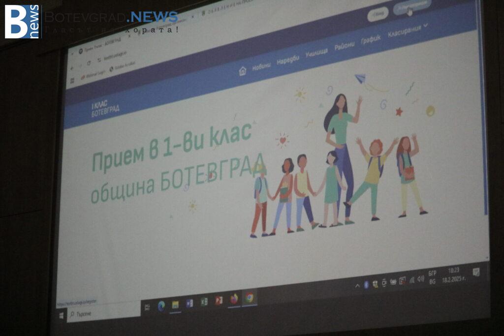 На 18 февруари в зала „Ботевград“ се проведе разяснителна среща относно проекта за електронен прием на ученици в първи клас, който ще стартира от есента. В присъствието на директори, учители, родители и общински съветници, кметът Иван Гавалюгов представи нововъведенията.