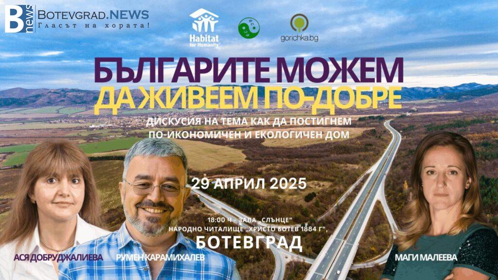 На 29 април от 18:00 часа в Народно читалище „Христо Ботев 1884 г.“ в Ботевград ще се проведе дискусия на тема как да постигнем по-икономичен и екологичен дом, без да жертваме уюта. Организатор е „Горичка“ – инициатива за разговори за устойчиво бъдеще, създадена от българската тенисистка и съосновател на марката биохрани „Хармоника“ Магдалена Малеева. Разговорът ще води Малеева, а презентации ще изнесат икономистът Румен Карамихалев и специалистът по енергийна ефективност Ася Добрдужалиева.