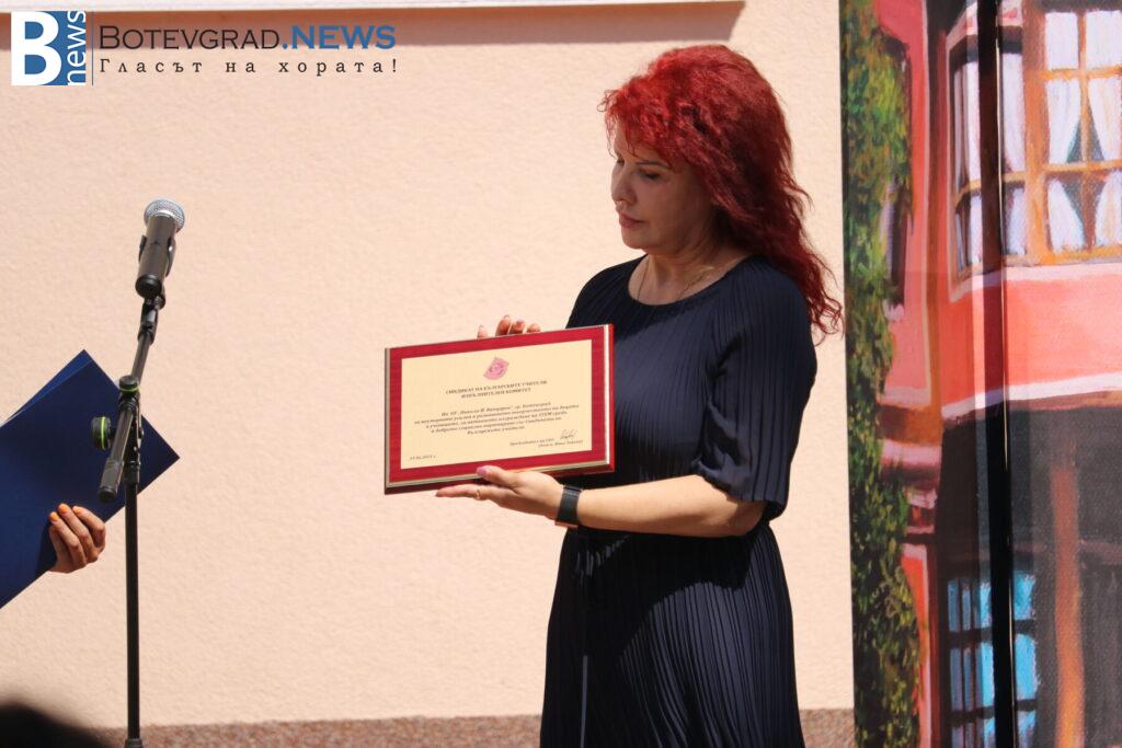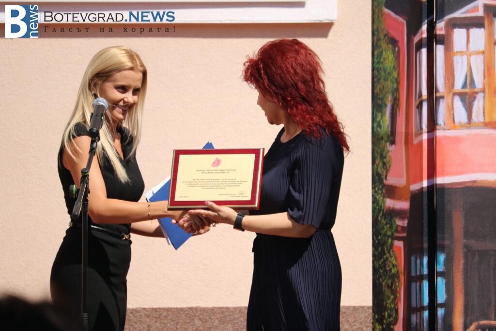 Директорът Петя Кочкова, получи Поздравителен адрес и Почетен плакет от Председателя на Съюза на българските учители – д. ик. н. Янка Такева, за заслуги на ръководството и училищния колектив в провеждането на съвременен, висококачествен образователен процес. в Поздравителния адрес се казва: