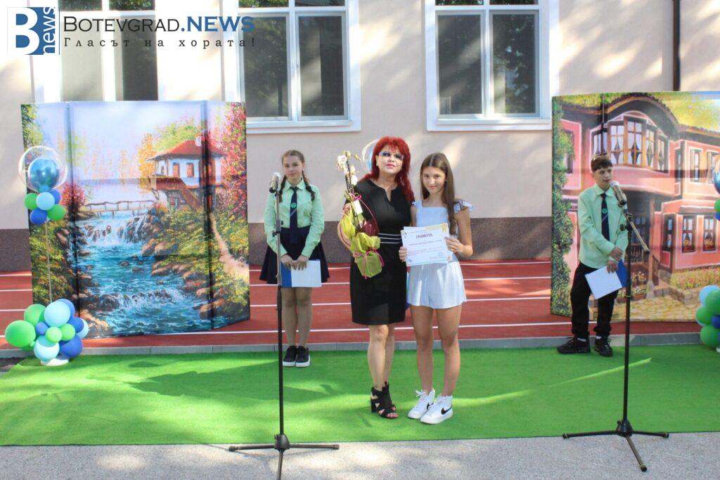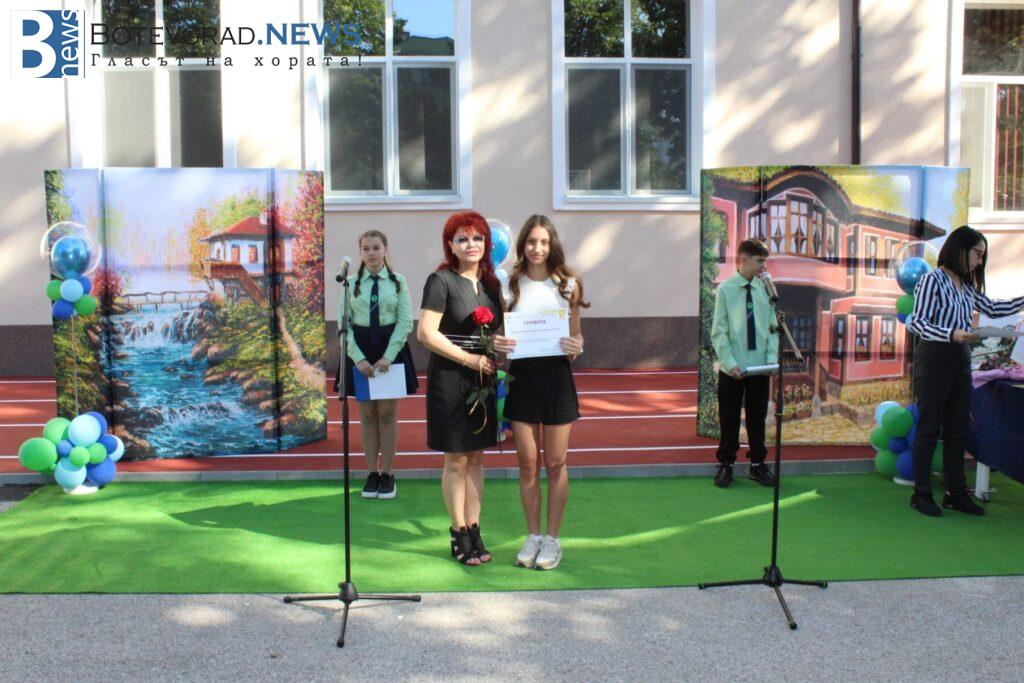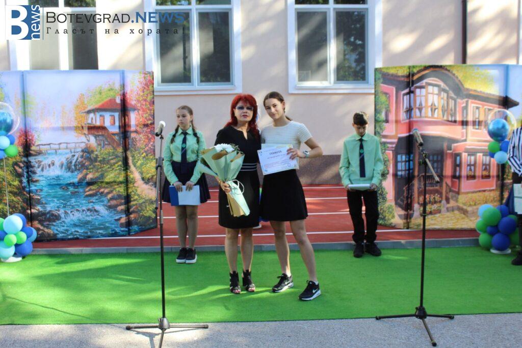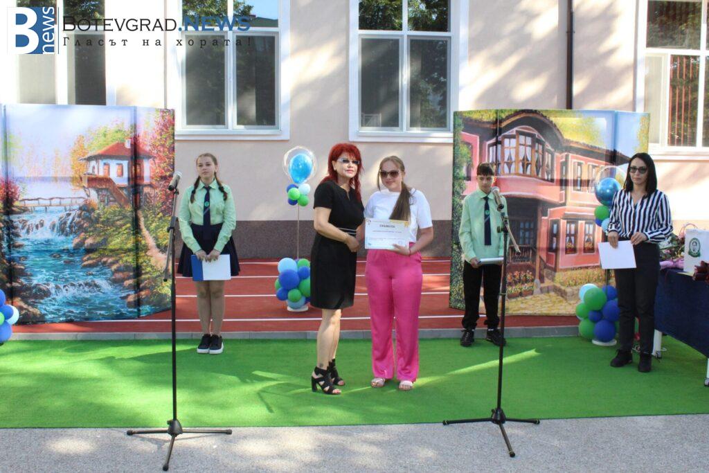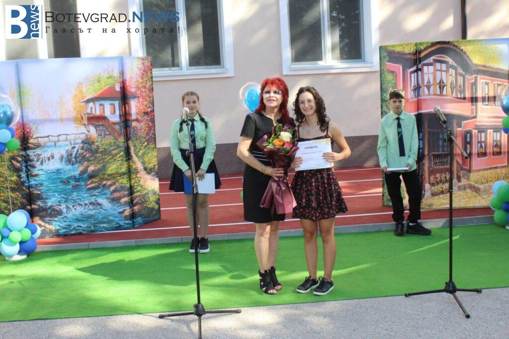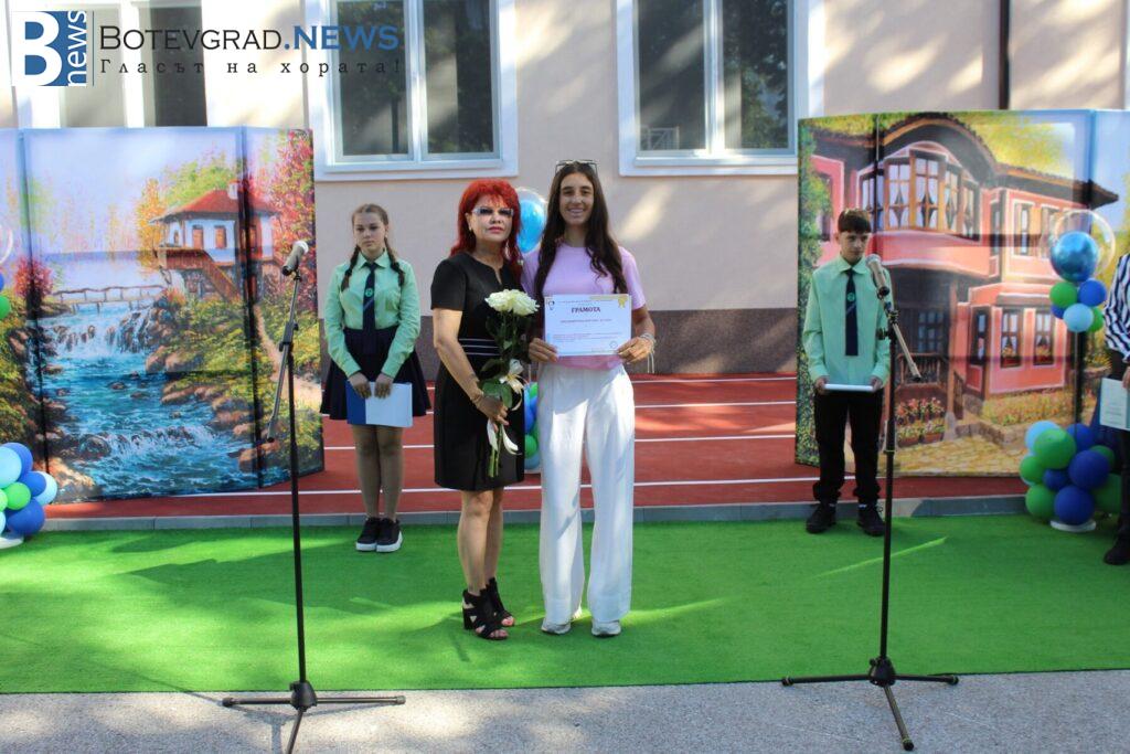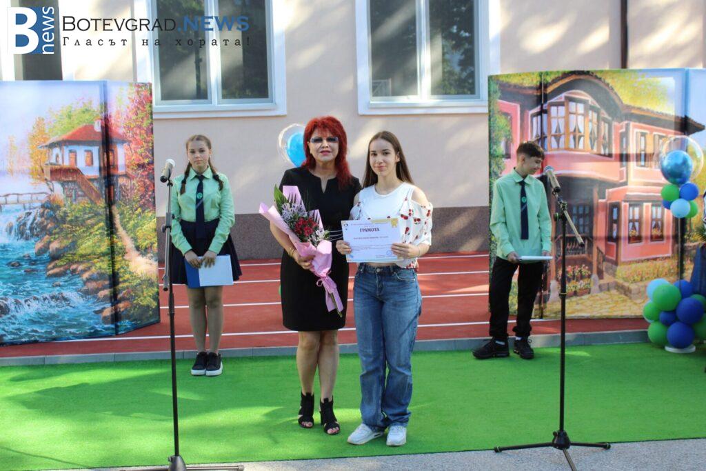 Г-жа Кочкова връчи грамоти на г-жа Светла Ралчева за доказан висок професионализъм и всеотдайност в педагогическата дейност и класирала училищния баскетболен отбор на първо място в страната, на г-жа Стефани Николова и г- жа Ванеса Христова, учители по Български език и литература, за постигнат висок резултат на НВО и за използване на иновативни методи в обучението.