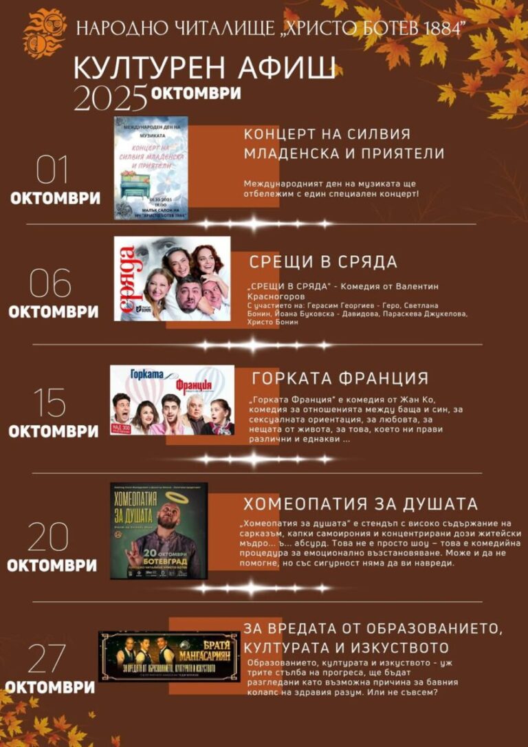 Народно читалище „Христо Ботев 1884“ – Ботевград обяви своя културен афиш за месец октомври 2025 г., който включва богата програма...