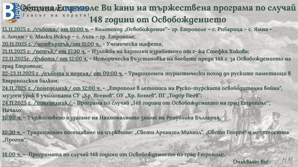 Община Етрополе предстои да отбележи 148 от освобождението на града. Публикуваме тържествената програма на мероприятията, по повод бележитата дата.