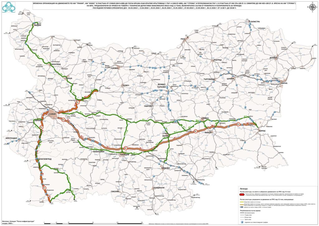 На интернет страницата на Агенция „Пътна инфраструктура“ е публикувана заповедта, която регламентира движението в определените празнични дни по АМ „Тракия“, АМ „Хемус“ – в участъка от София (км 0) до пътна връзка при кръгово кръстовище с път I-4 (87-ми км), АМ „Струма“ и републикански път I-1 в отсечката от п. в. „Симитли“ (376-ти км) до п. в. „Кресна“ на АМ „Струма“ (402-ри км). В нея са посочени предстоящите ограничения за преминаване на тежкотоварните автомобили в определените дни и часове.