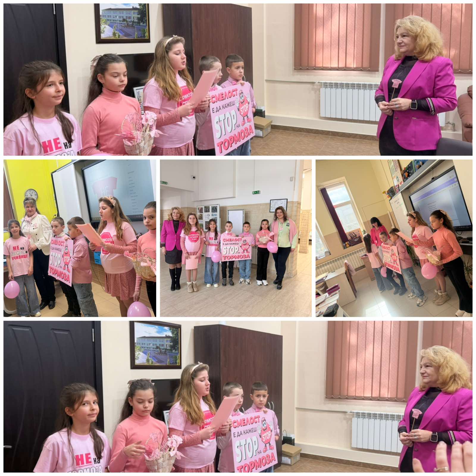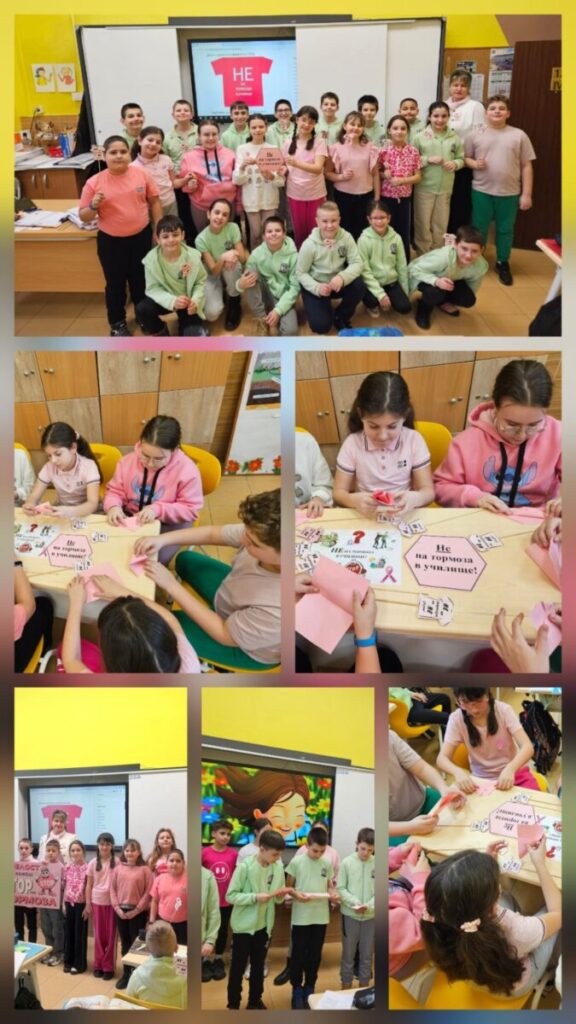 С активното съдействие на психолозите, педагогическия съветник и преподавателите, децата се включиха в творчески дейности – изработване на табла, картички и стикери, създаване на презентации, тематични подаръчета и формулиране на вдъхновяващи послания срещу агресията.