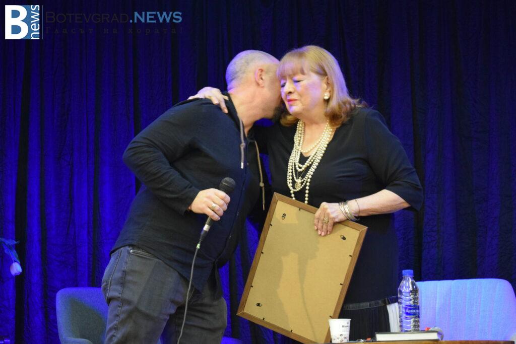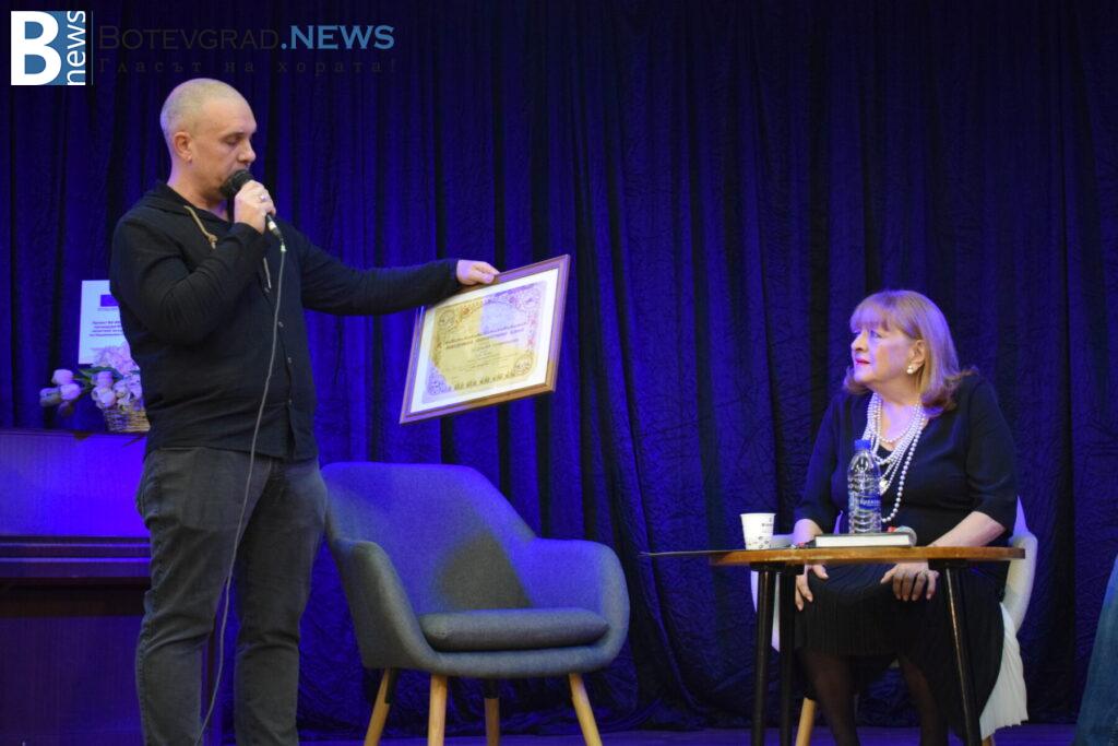 Един от най-вълнуващите моменти настъпи, когато учителят по история и редактор в сайта „Балканец“ Николай Борисов поднесе специален подарък на певицата – автентичен документ от 1942 година, свързан с нейния баща Иван Карадочев. Историческият документ представлява дял от Македонската кооперативна банка и предизвика силни емоции у артистката.