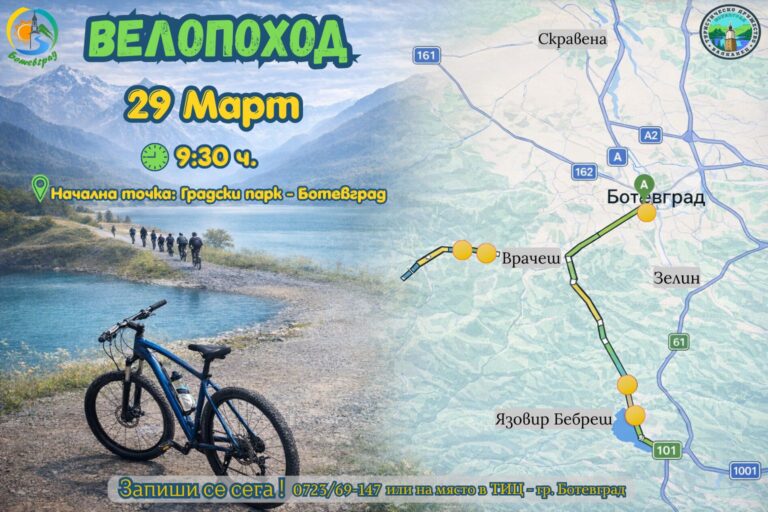 Общинско предприятие „Туризъм“ и туристическо дружество „Балканец“ организират велосипеден поход на 29 март (неделя) по маршрут Ботевград - язовир „Бебреш“...