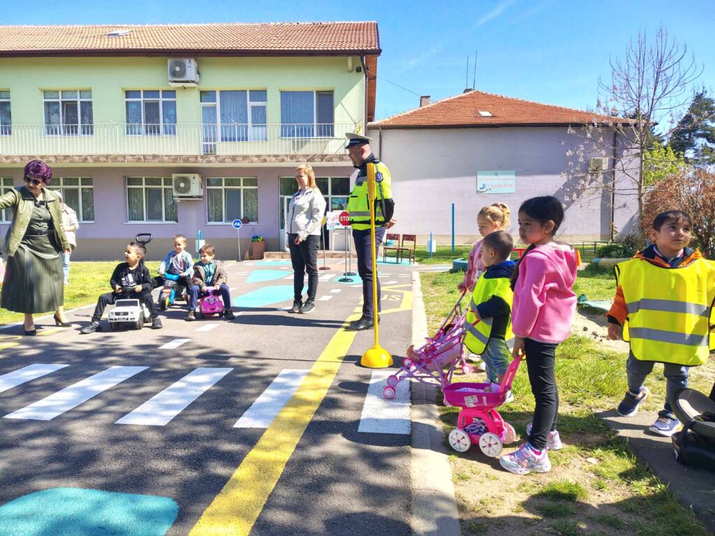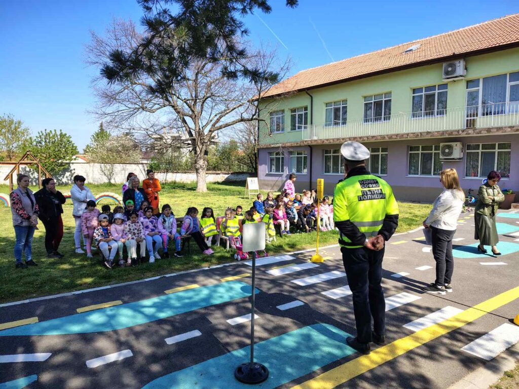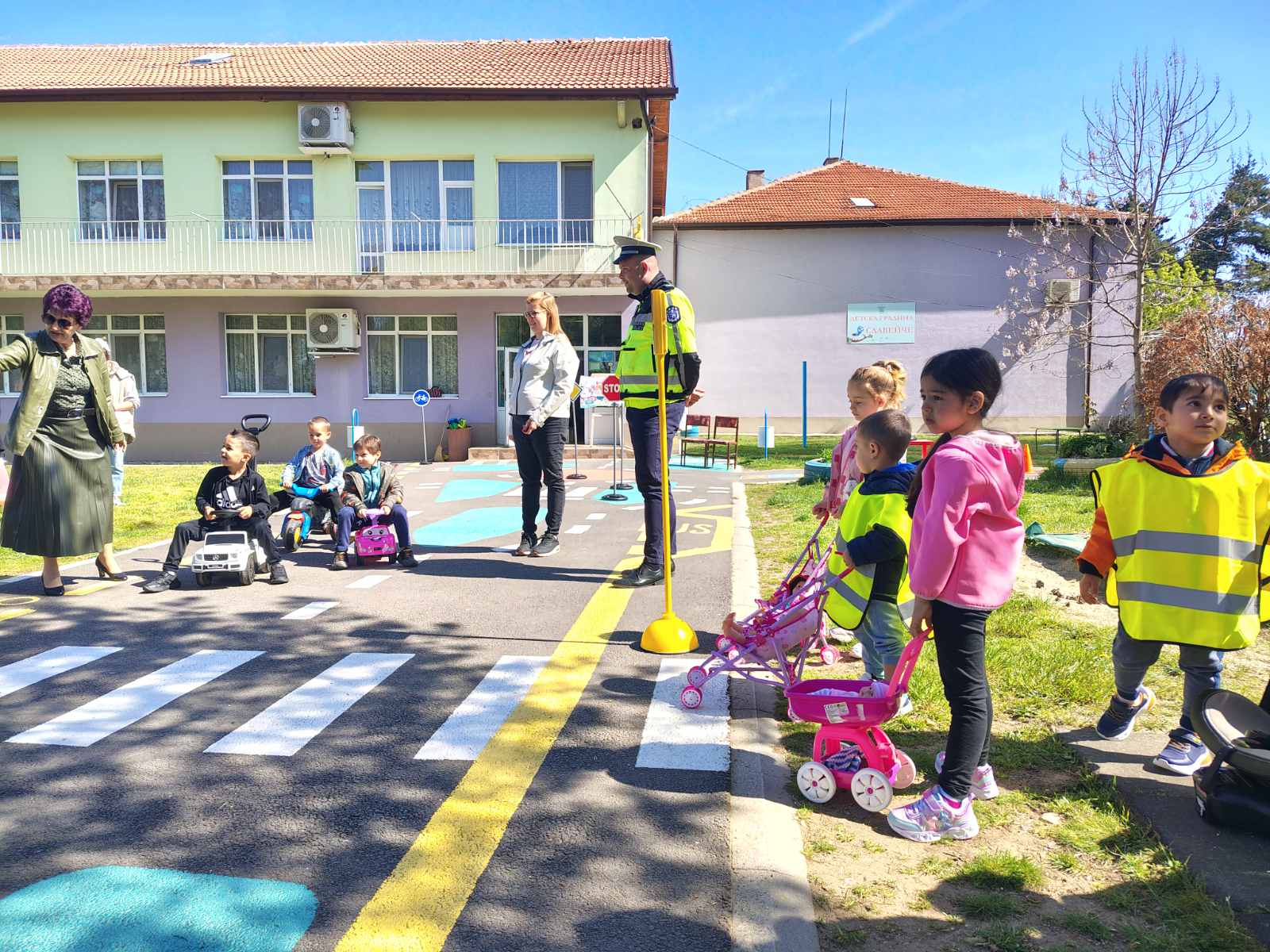 Инсп. Даниел Йорданов от Пътна полиция при РУ-Елин Пелин посети подготвителните групи на детското заведение и проведе практическо занятие по пътна безопасност. Под неговите напътствия бяха упражнени на терен придобитите вече теоретични знания.