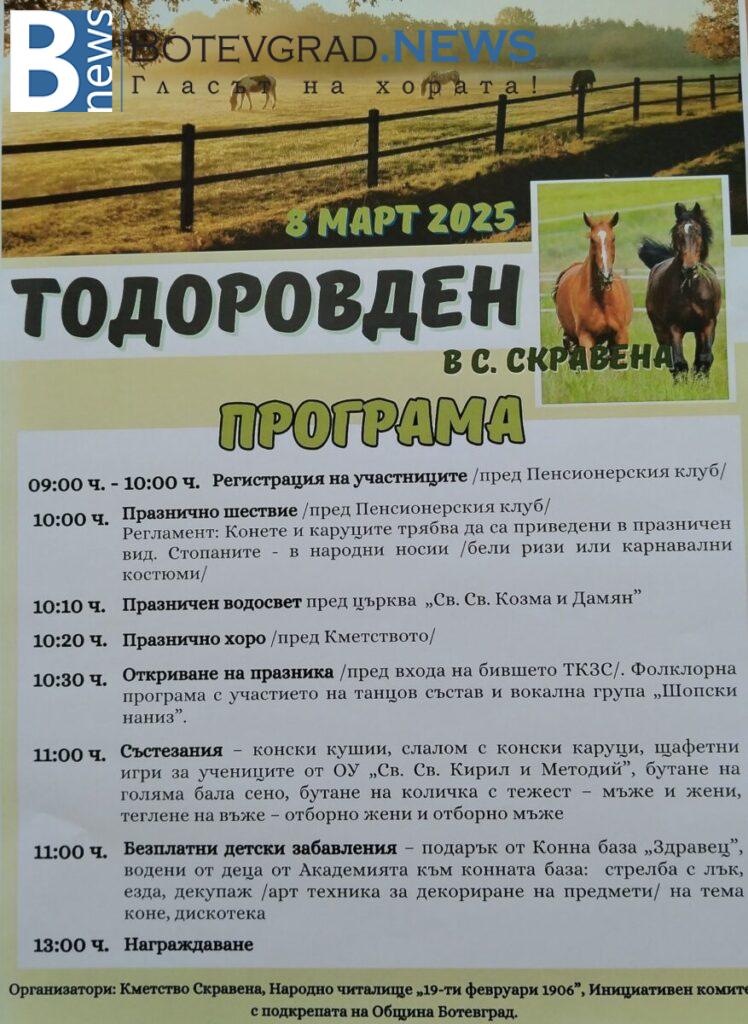 За втора поредна година Кметство Скравена, Народно читалище “19-ти февруари 1906“ и Инициативен комитет, със съдействие на Община Ботевград, организират провеждането на празнично отбелязване на Тодоровден. Както традицията повелява ще се проведат конски надбягвания /кушии/, слалом с конски каруци, щафетни игри и бутане на голяма бала сено, теглене на въже и др.